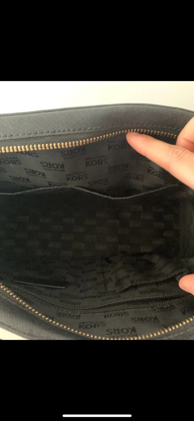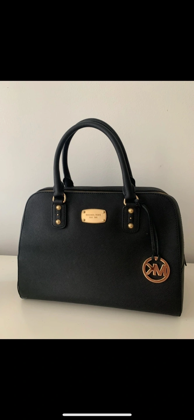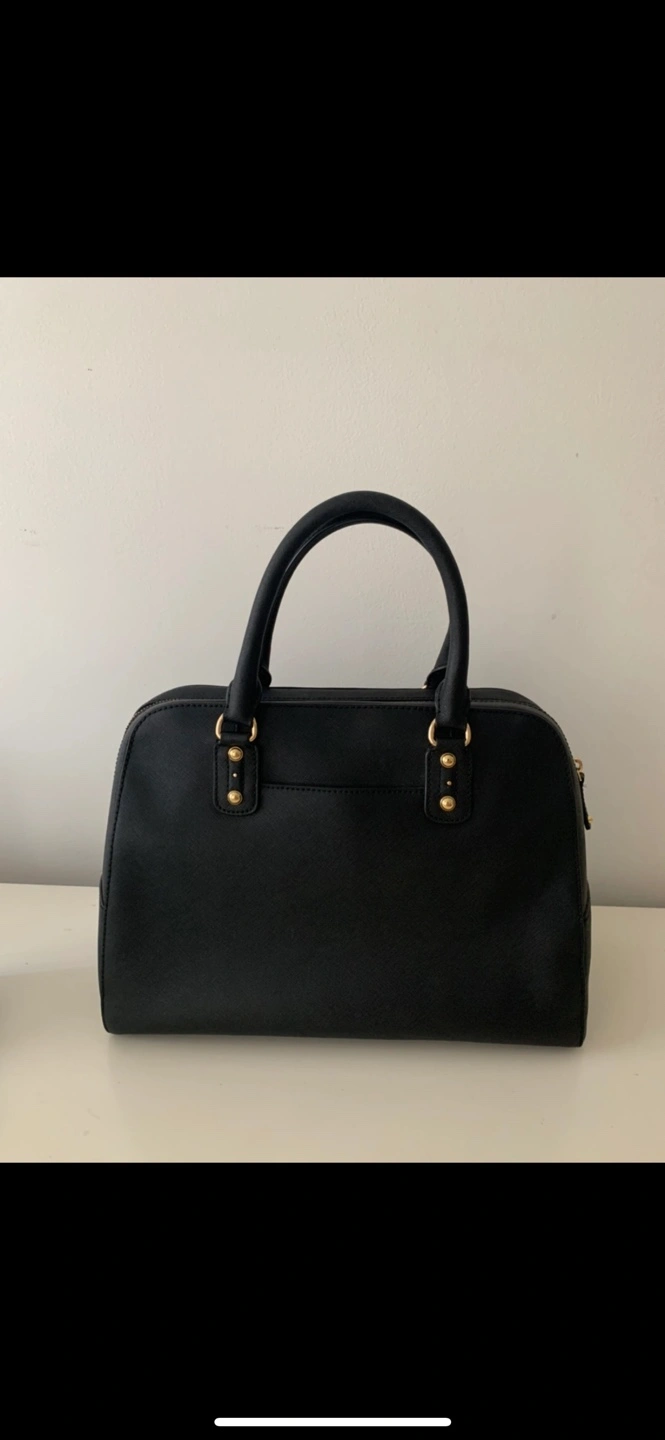 Black satchel. Gold-tone hardware. Zip closure. Interior pockets. Excellent condition.