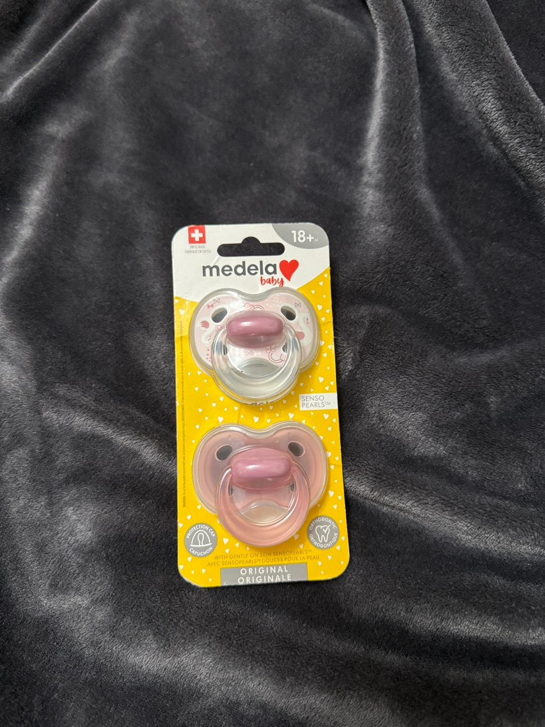 Two Medela baby pacifiers. Size 18+. New in package. Features Sensopearls for gentle skin contact. Orthodontic design.