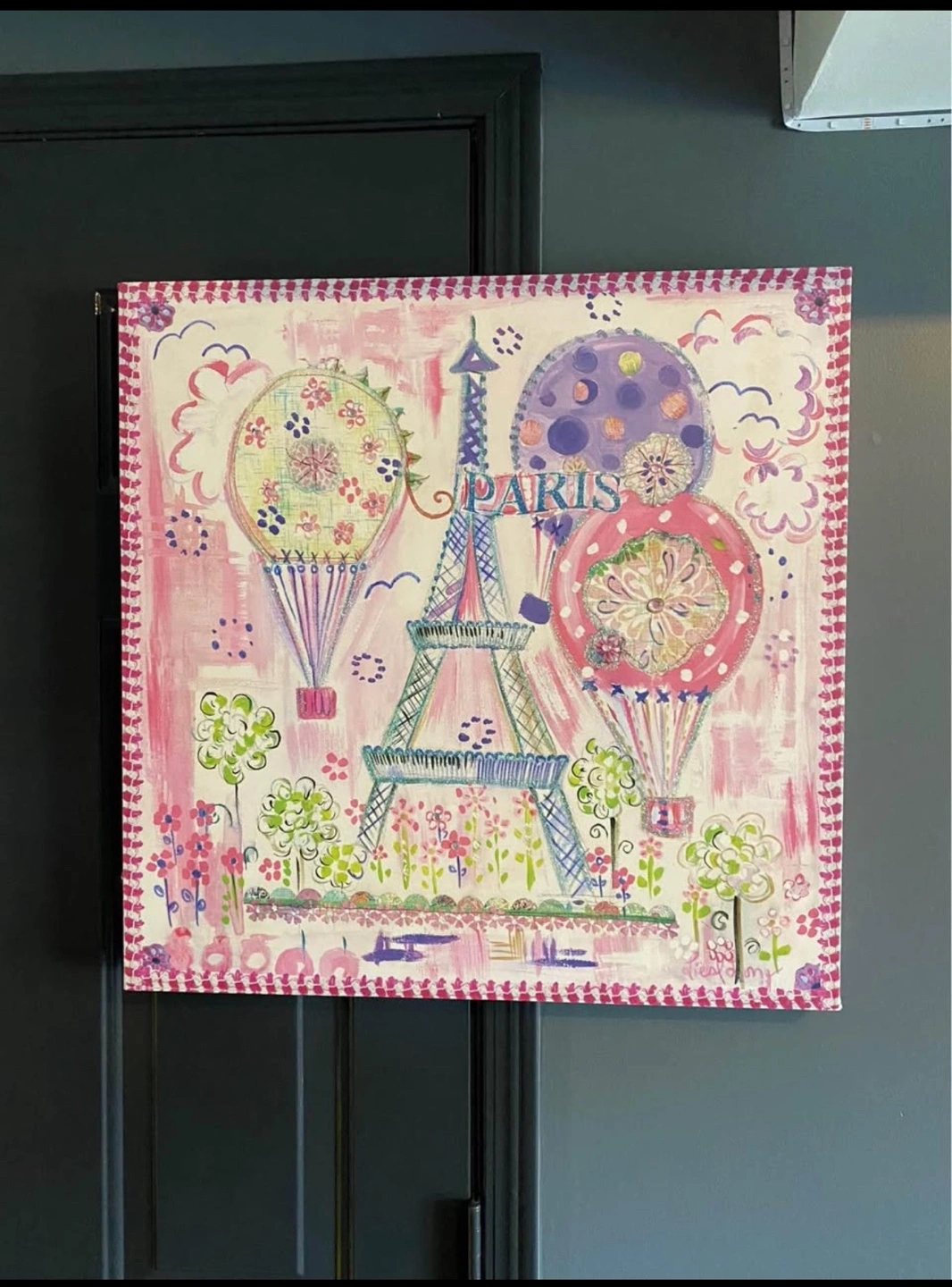 Cute pink and purple artwork. Features hot air balloons and the Eiffel Tower. Perfect for a child's room or nursery. Square canvas.