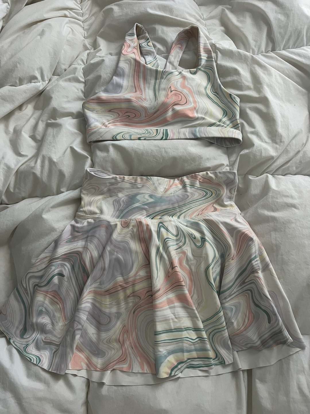 Matching sports bra and mini skirt set. Features a pretty marble print in pastel colours. Great for working out or casual wear.