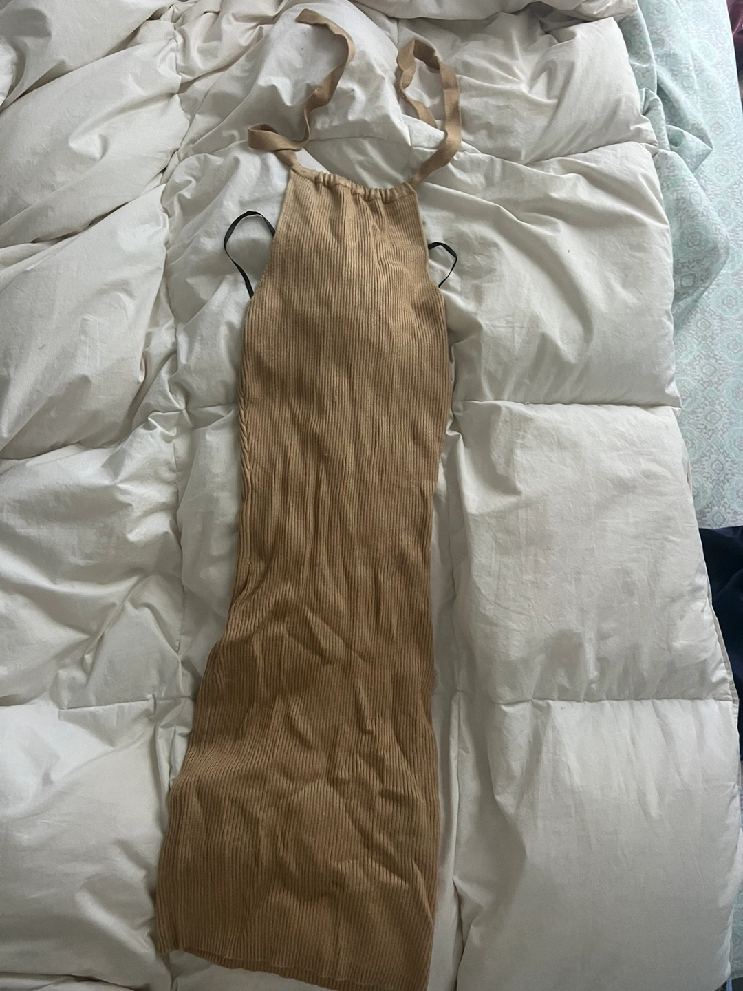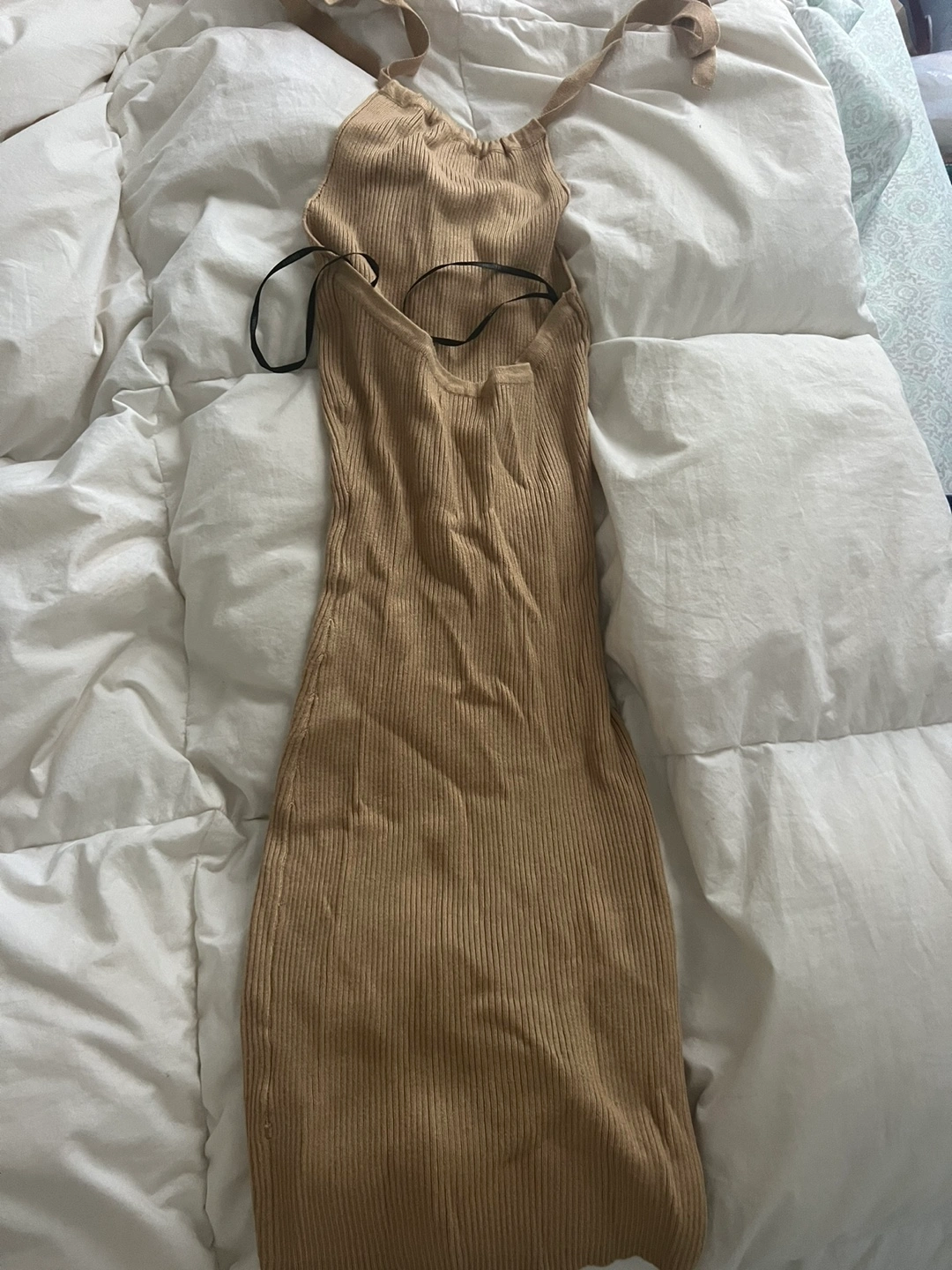 Beautiful tan ribbed knit midi dress. Halter neck style with thin straps. Figure-hugging fit. Lightweight and stretchy material. Perfect for a night out or special occasion.