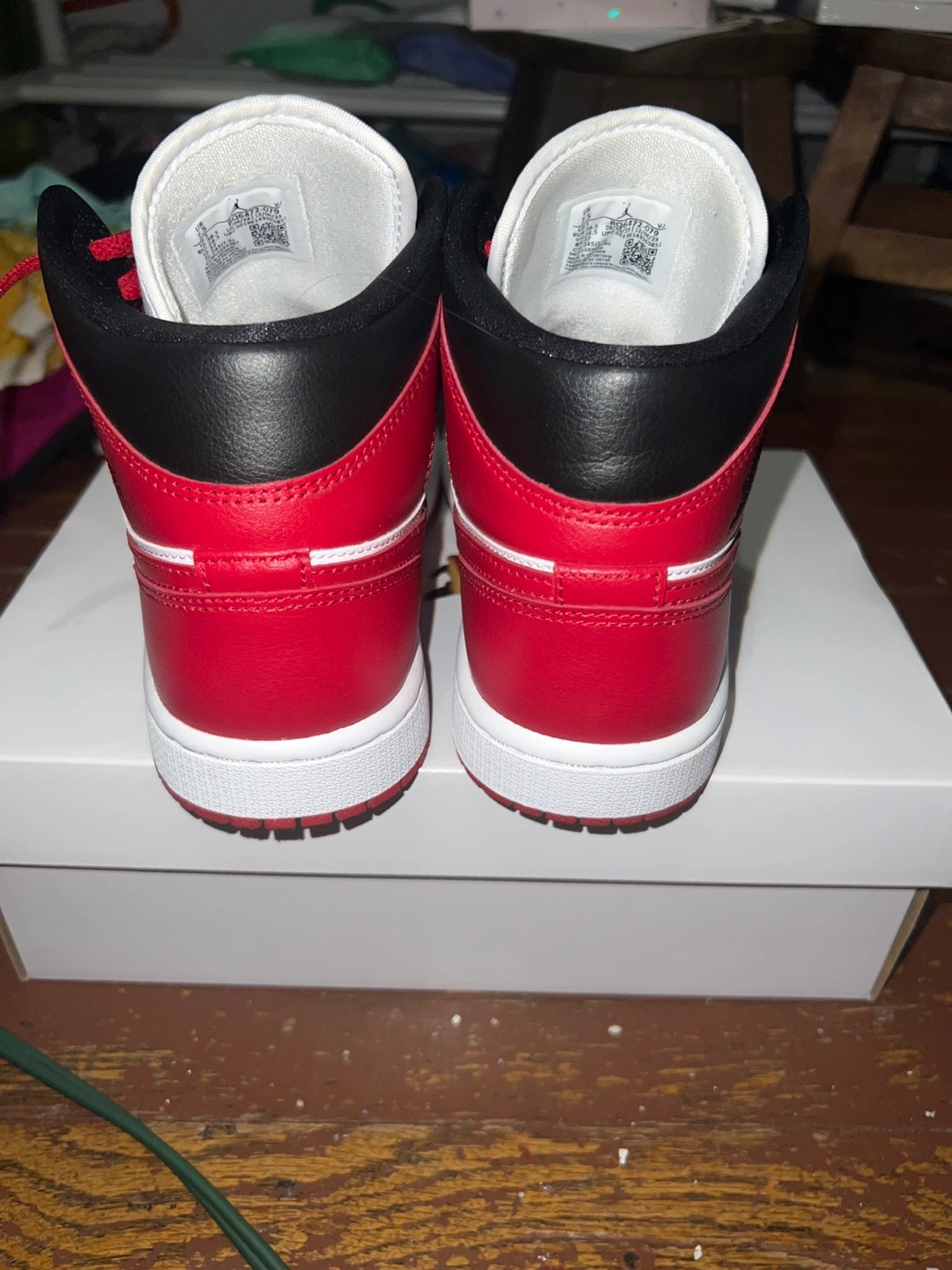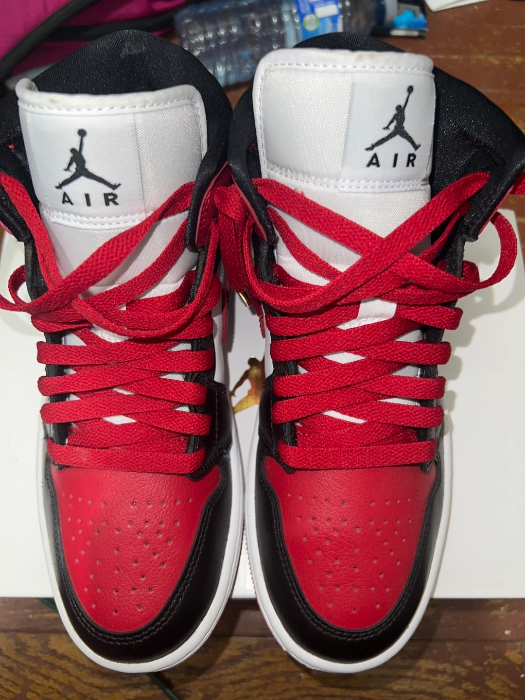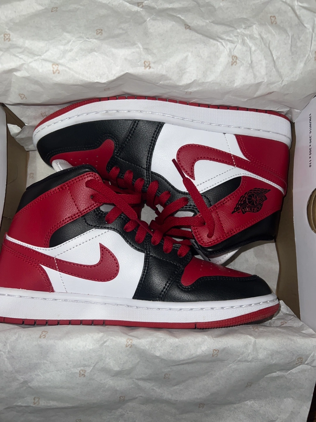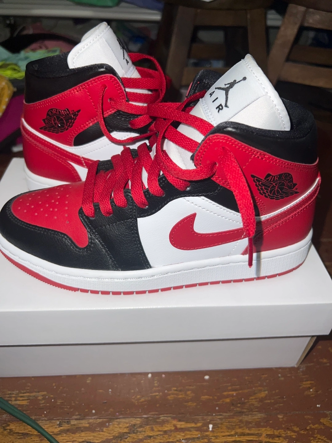 Women's Air Jordan 1 Mid sneakers. Size 7.5. Red, black, and white colourway. New with box.got them as a graduation gift. And I also allow offers