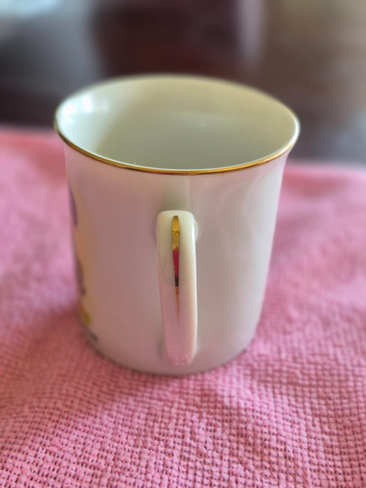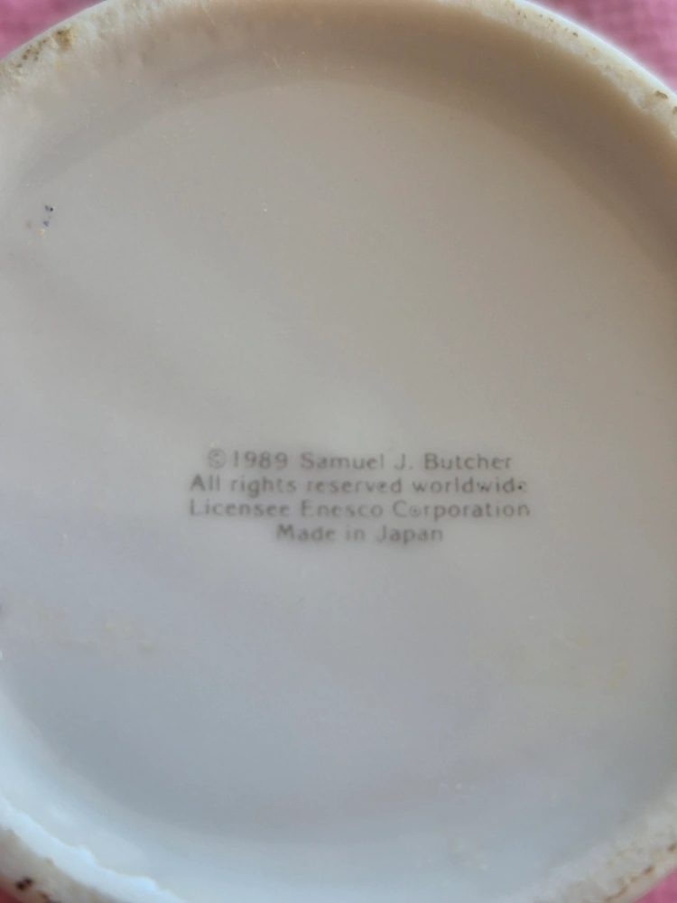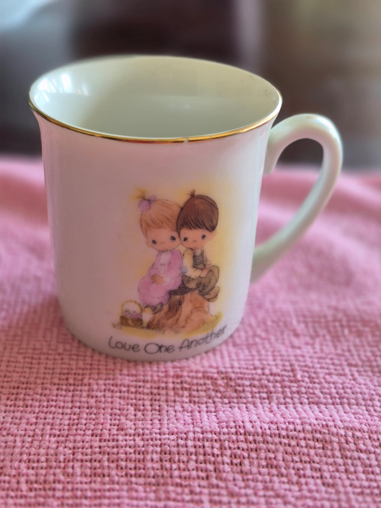 Adorable vintage Precious Moments mug. Features two children sitting on a log. Porcelain with gold trim. Samuel J Butcher 1989 Enesco Corporation.