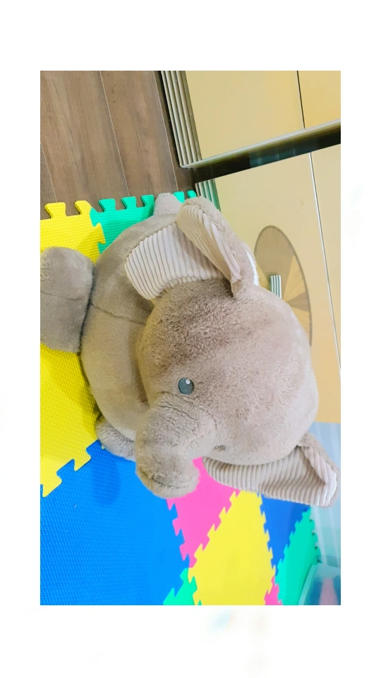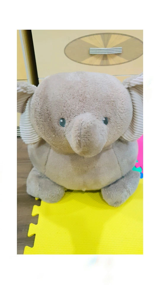 Adorable large plush elephant. Grey and cream colours. Soft and cuddly. Perfect for children's play or bedroom decor.