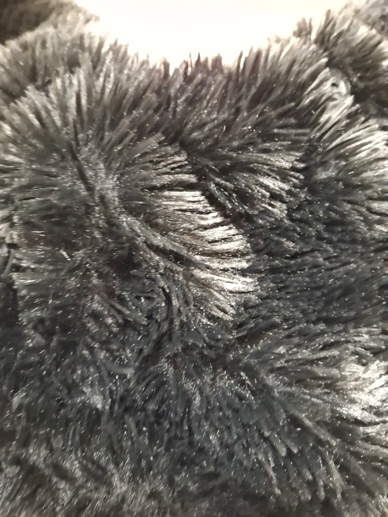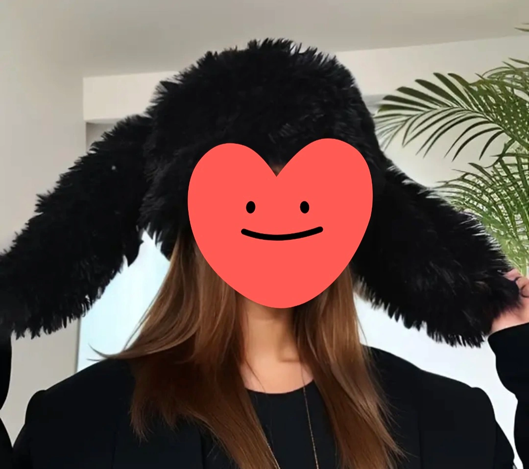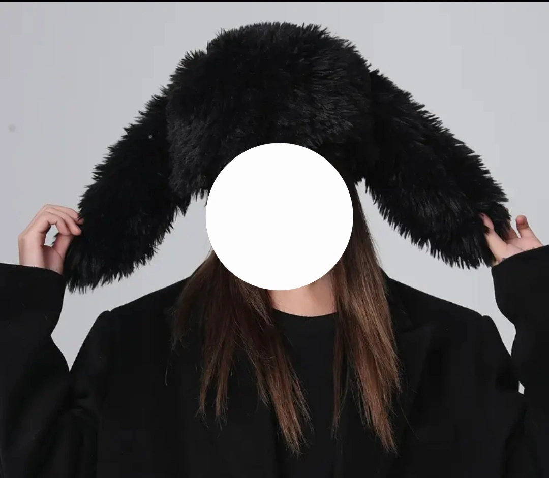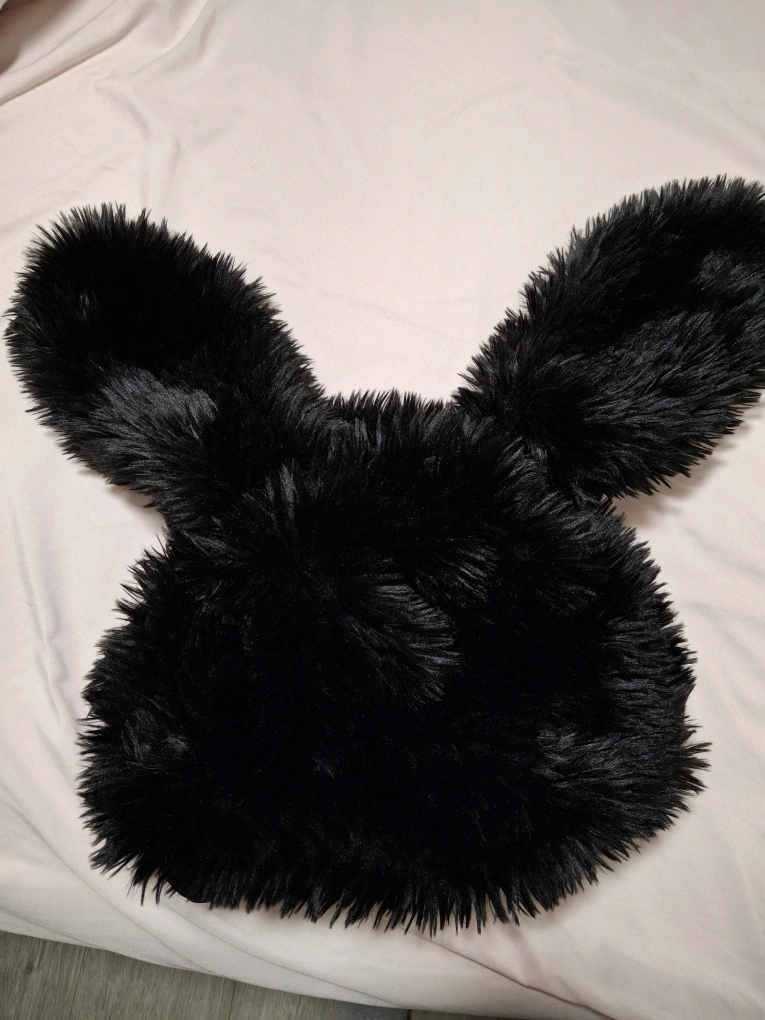 Adorable black fuzzy hat. Features long bunny ears. Soft and warm material. Perfect for a playful look.