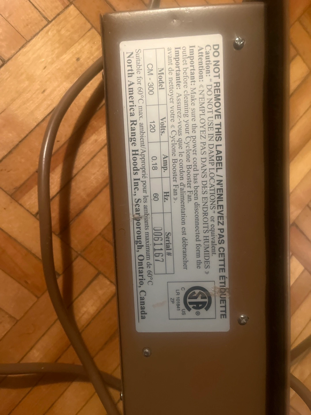 Brown metal exhaust fan. Includes power cord. Model CM 300. Made in Canada. North America Range Hoods Inc.