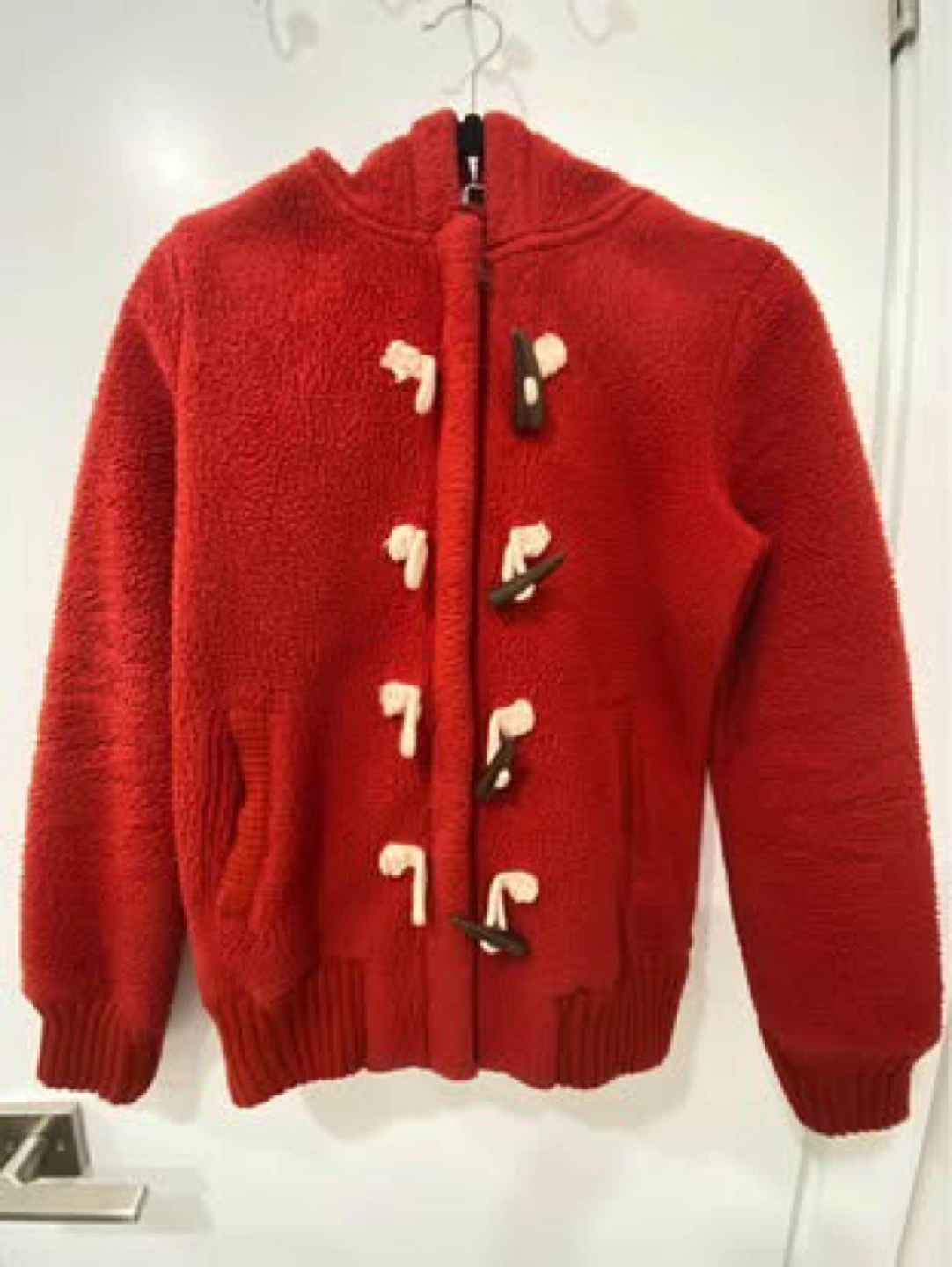 Women's red fleece jacket. Features a hooded design, toggle fastening, and ribbed cuffs and hem. Size medium.