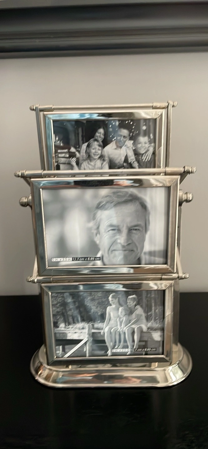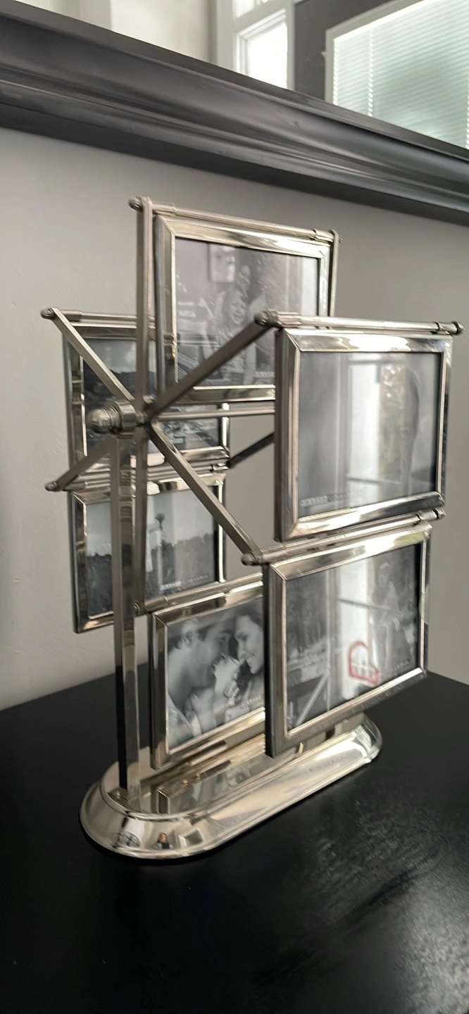 Rotating photo frame. Holds multiple photos. Silver metal finish. Elegant design. Great for displaying family photos.