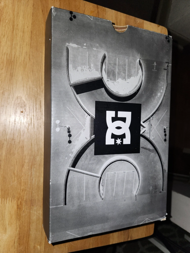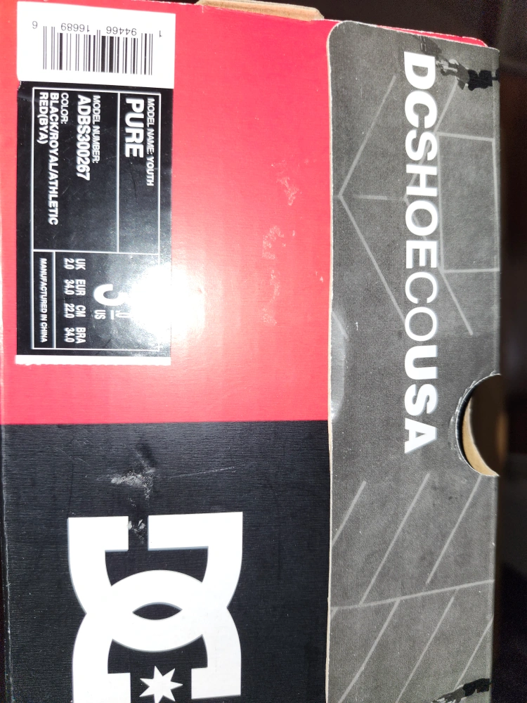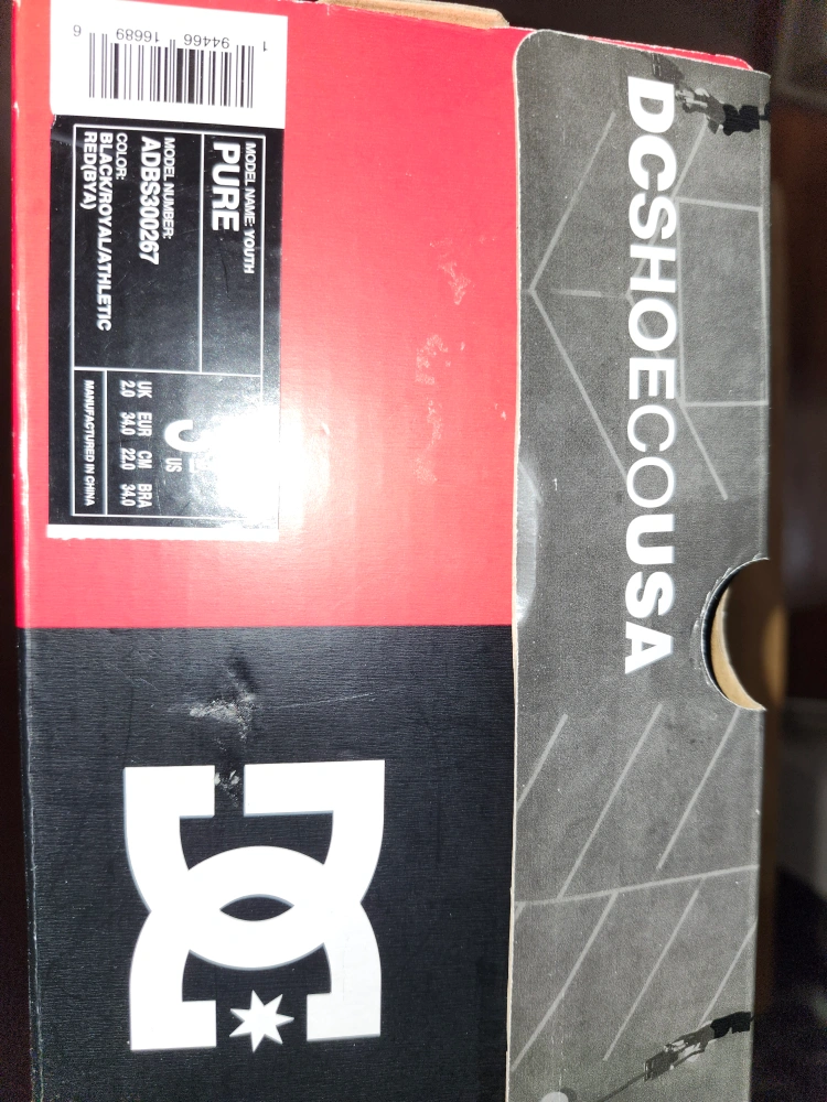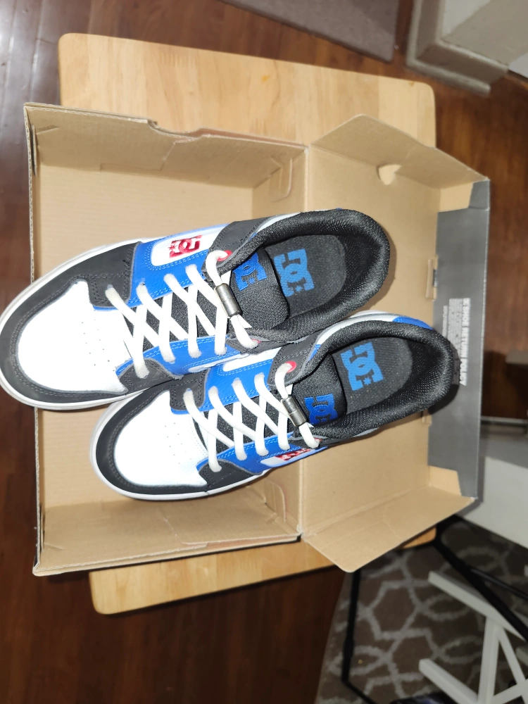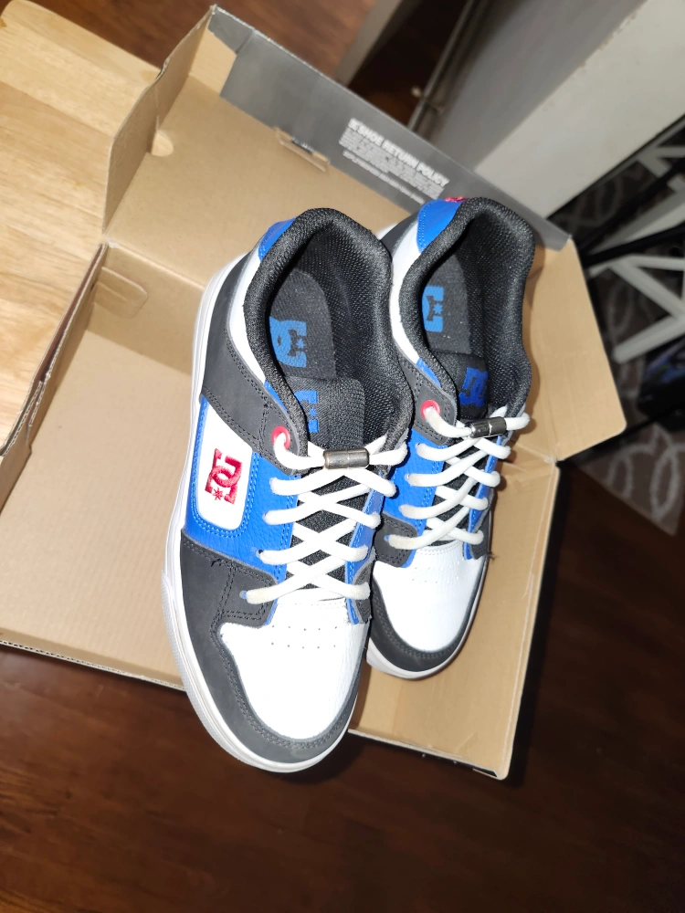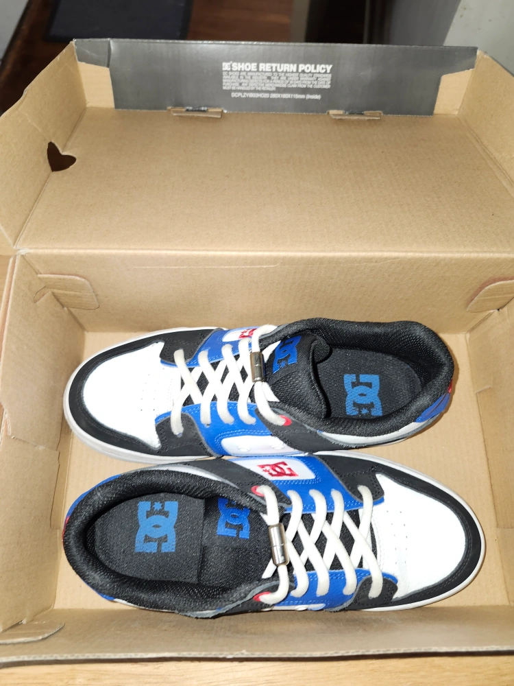 great condition DC Shoes Pure model youth skate shoes. Size 3. Black, white, and blue colour scheme. In original box.