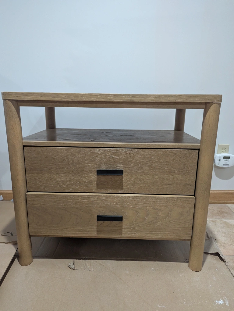 Light brownnatural wood nightstand. Two drawers with black pulls.