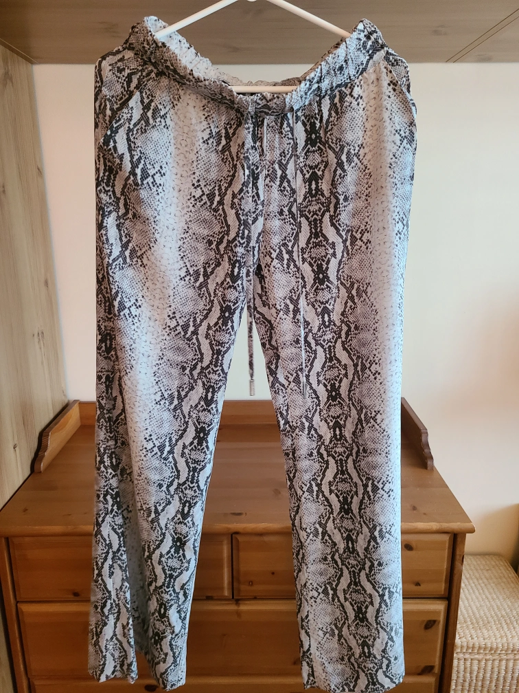 Women's wide-leg pants. Snakeskin print. Elastic waistband with drawstring. Lightweight material.