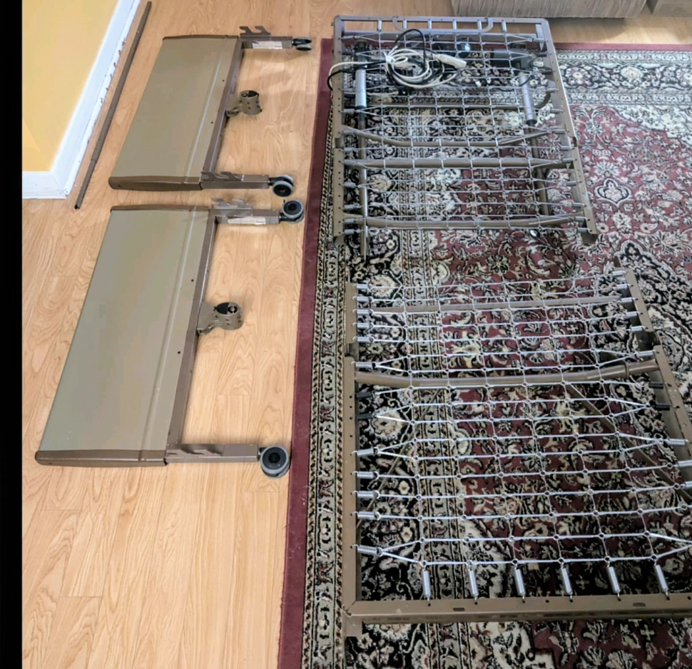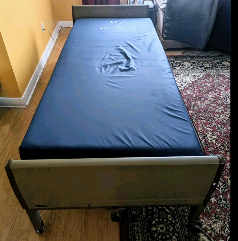 Offering an electric, fully adjustable Invacare heavy duty metal frame hospital bed, removable and adjustable heavy duty safety side rails, premium Drive brand hospital grade mattress and a waterproof mattress cover.