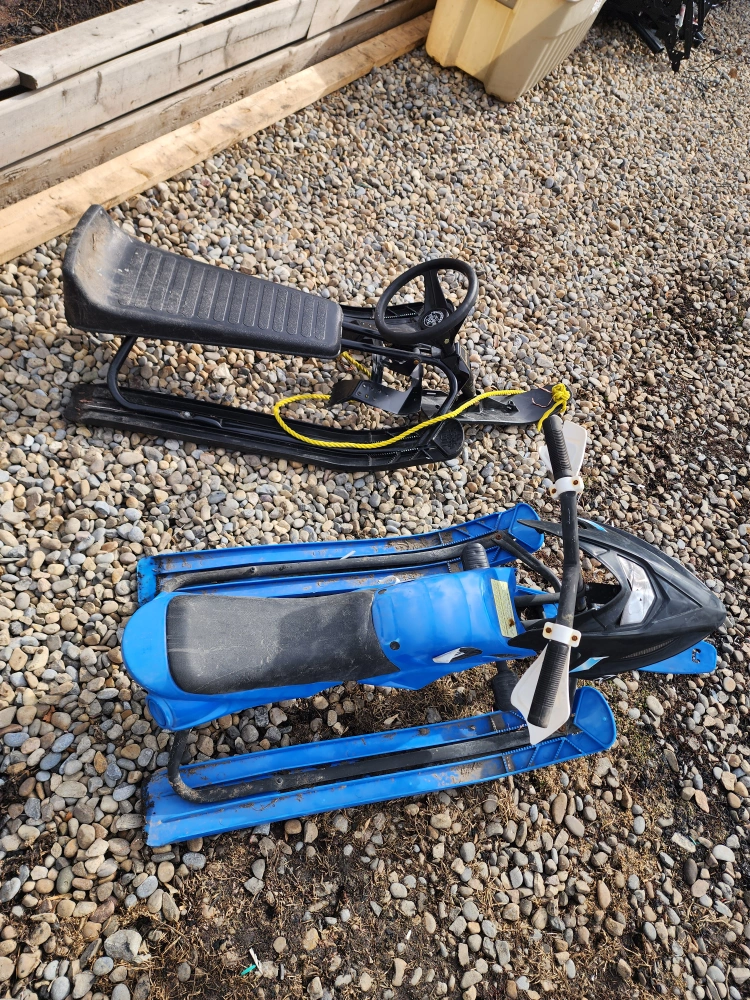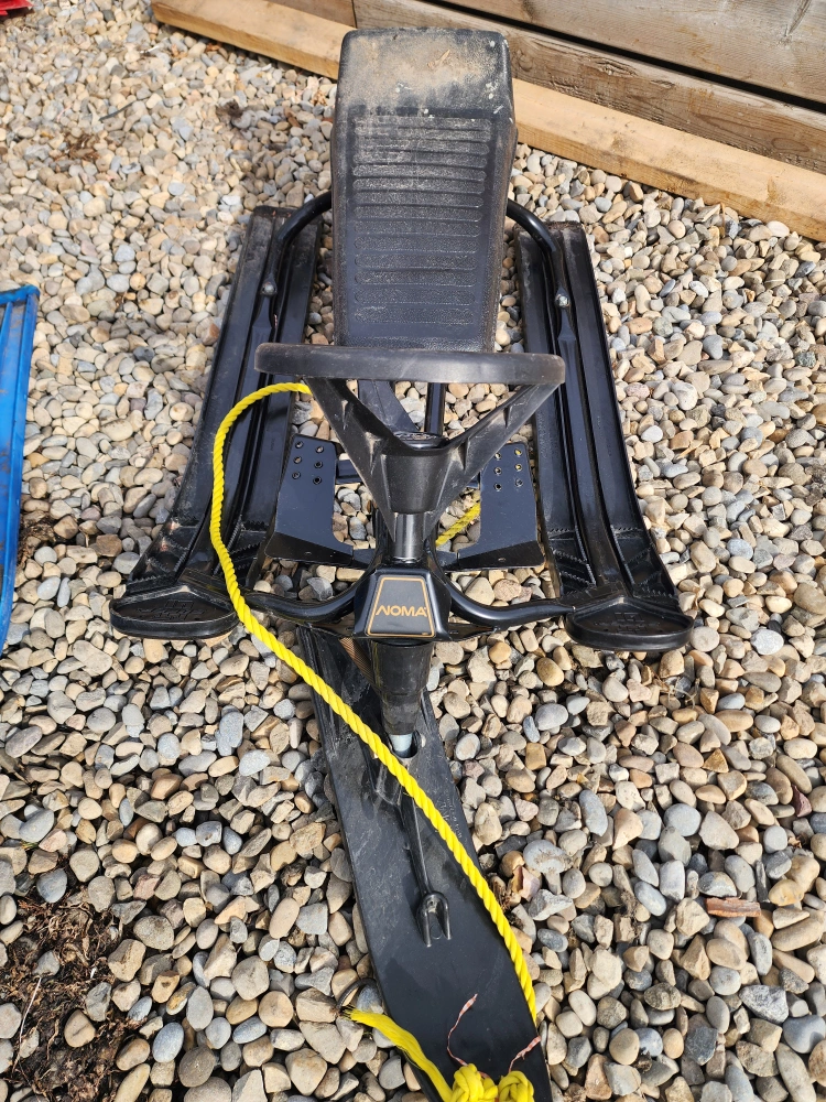 83Pair of children's snow sleds. One black sled with steering wheel and tow rope, brand Noma. One blue plastic sled with handlebars. Used condition.