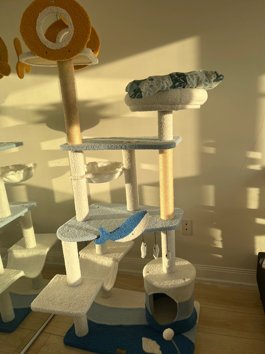 Multi-level cat tree. Features several platforms, a condo, scratching posts, and dangling toys. Blue and white colour scheme. Good for cats to climb and play.