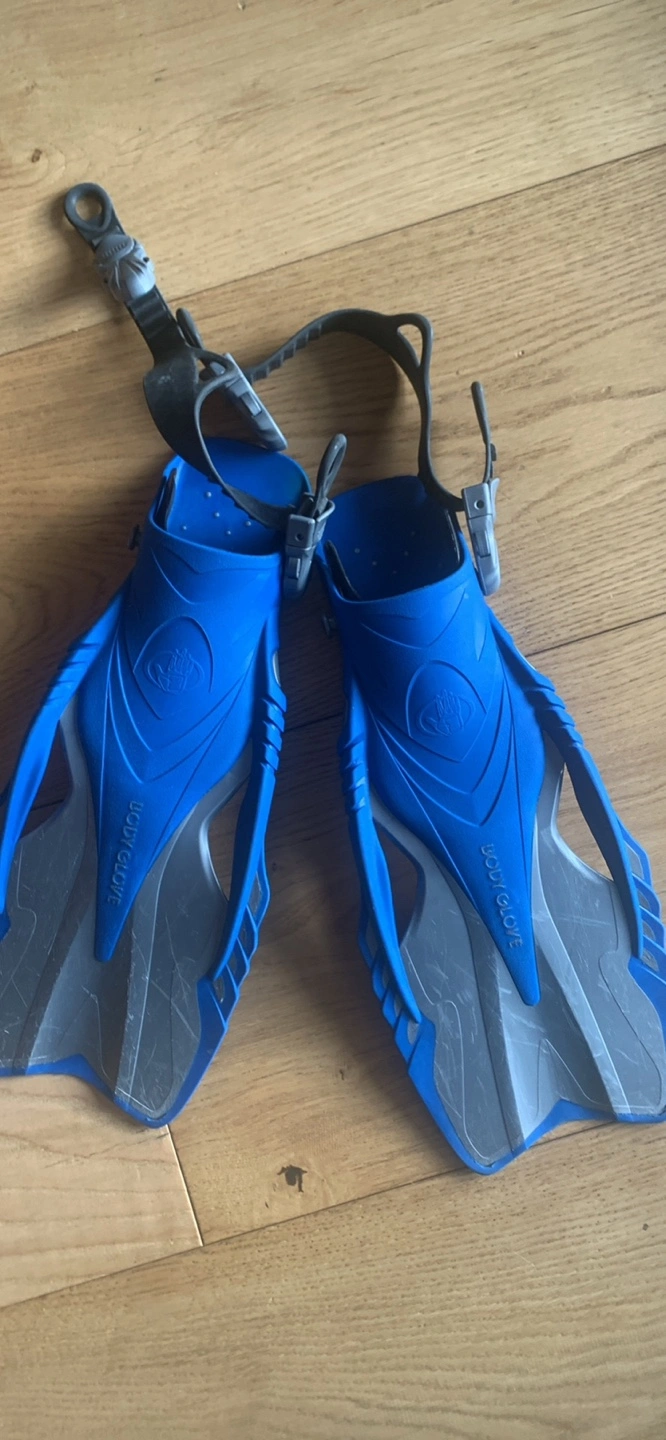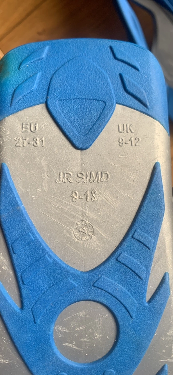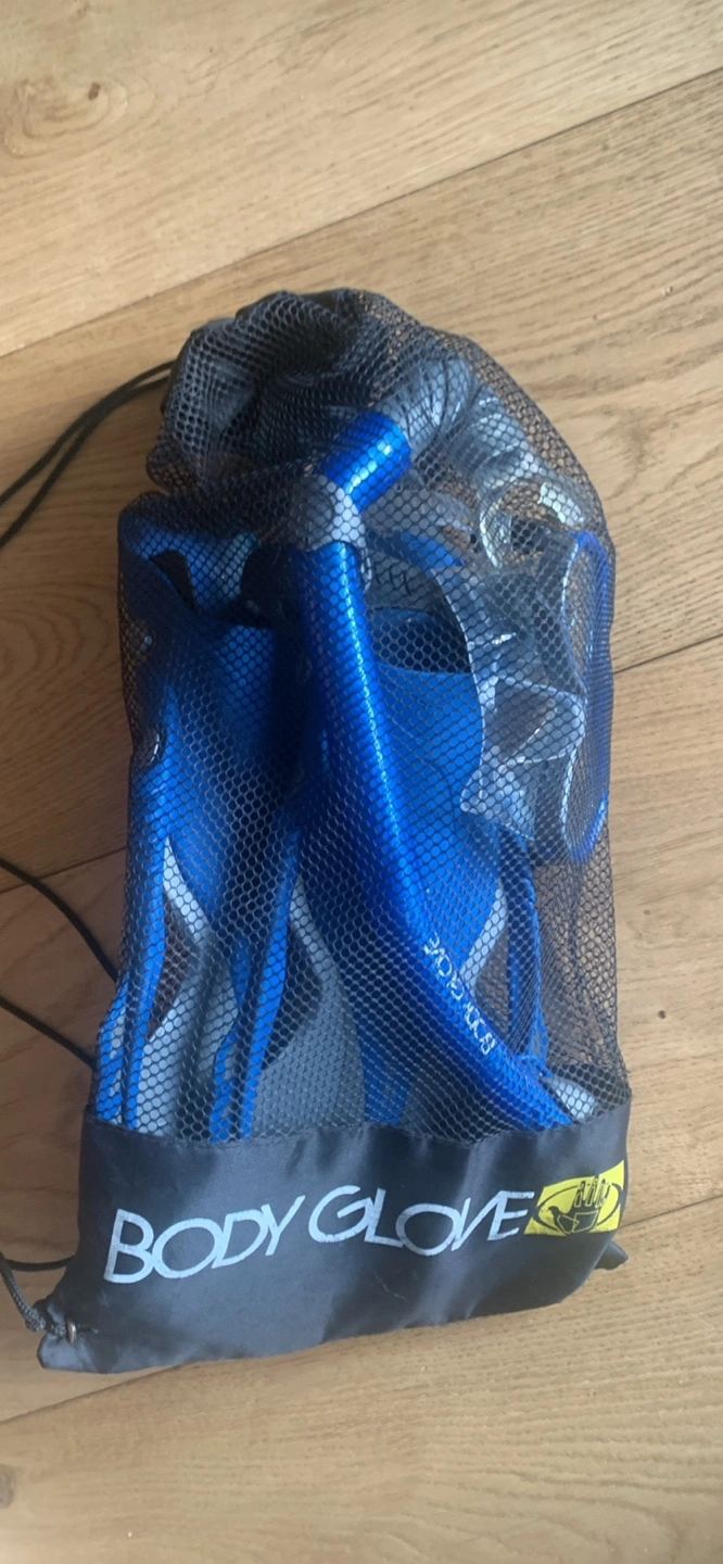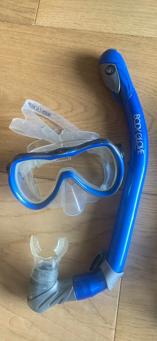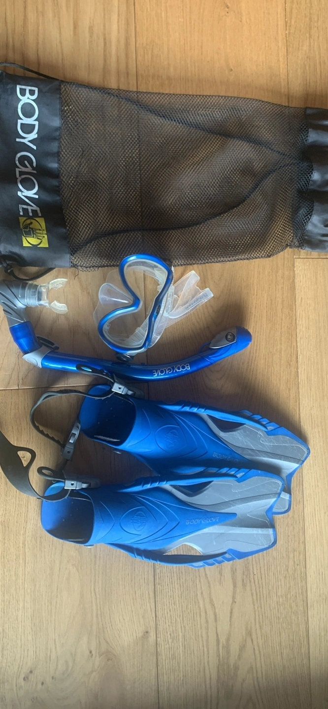 Youth snorkeling set includes mask, snorkel, and fins. Blue and grey. Comes in mesh bag. Size 9-12 UK. Good for kids. Pick-up on Balsam Avenue south of Queen street.