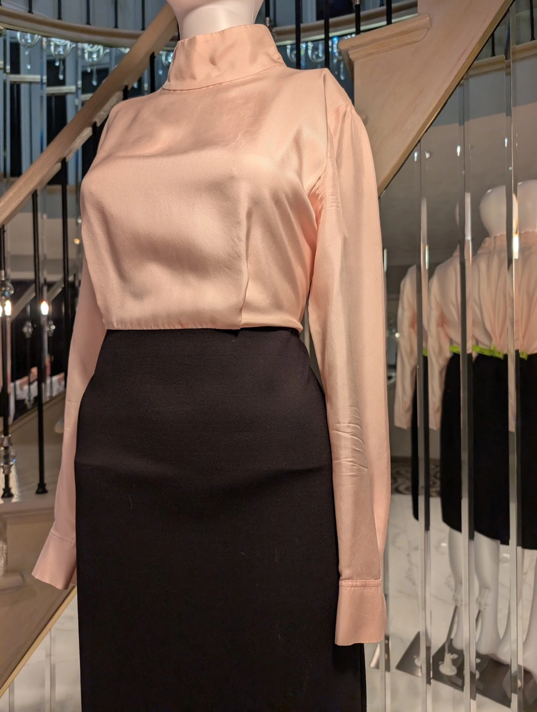 109Gorgeous Ted Baker London set. Peach coloured blouse, long sleeves, high neck. Black pencil skirt. Professional, stylish outfit.