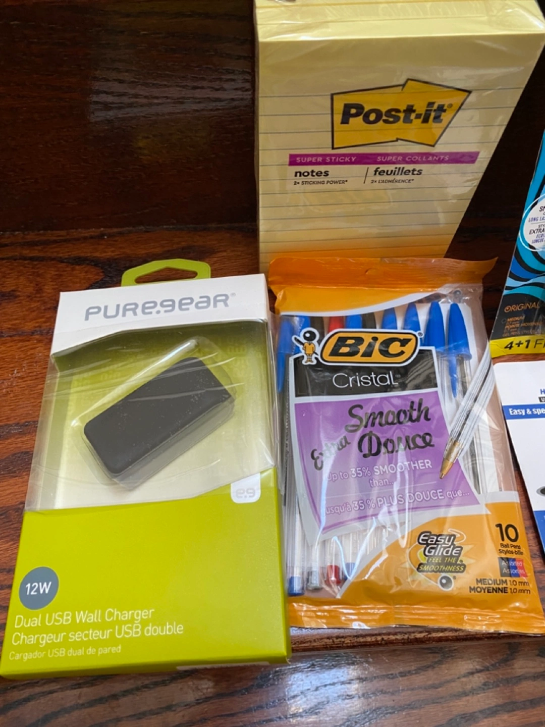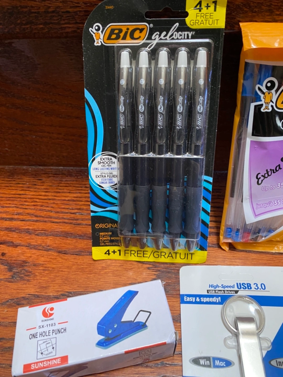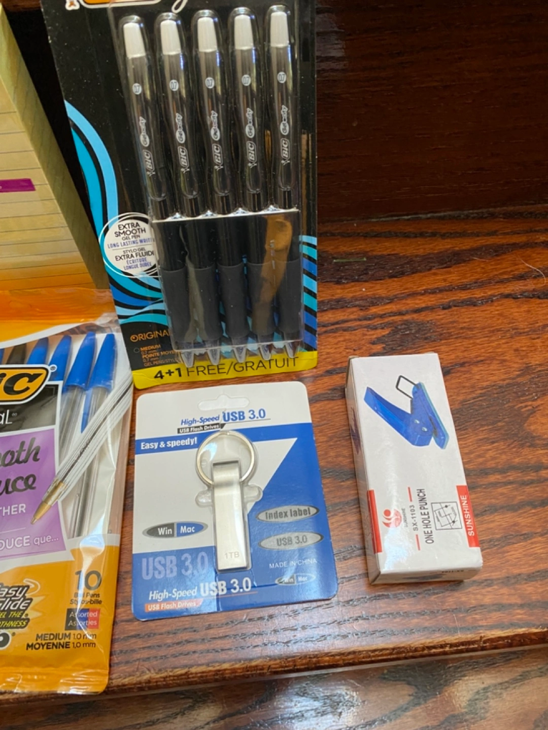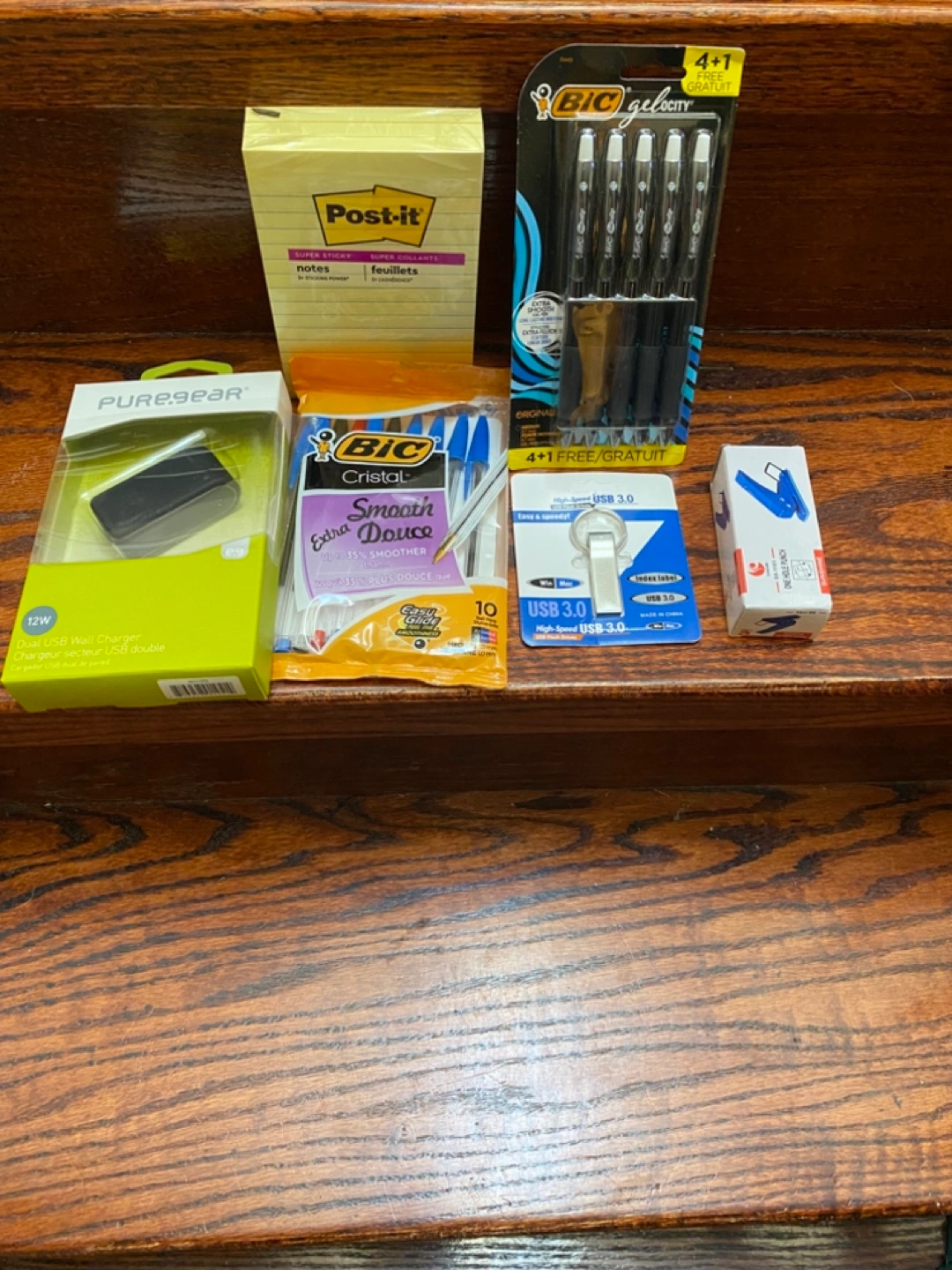 507Grab this convenient bundle of office supplies! Includes BIC Cristal pens, BIC Gel-ocity pens, Post-it notes, a PureGear 12W dual USB wall charger, a 1TB USB 3.0 flash drive, and a small hole punch. Perfect for students or anyone needing a quick office supply refresh. Cash Only