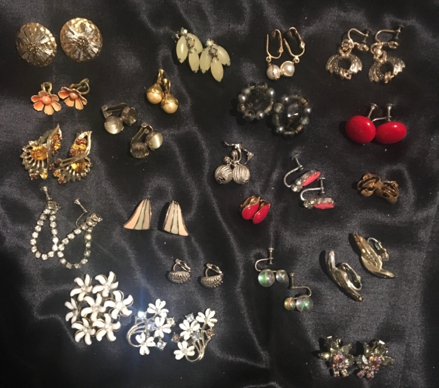 372Collection of vintage earrings. Variety of styles and colours. Includes clip-on and screw-back options. Many different stones and materials. Unique pairs and in excellent condition! $25 for all!