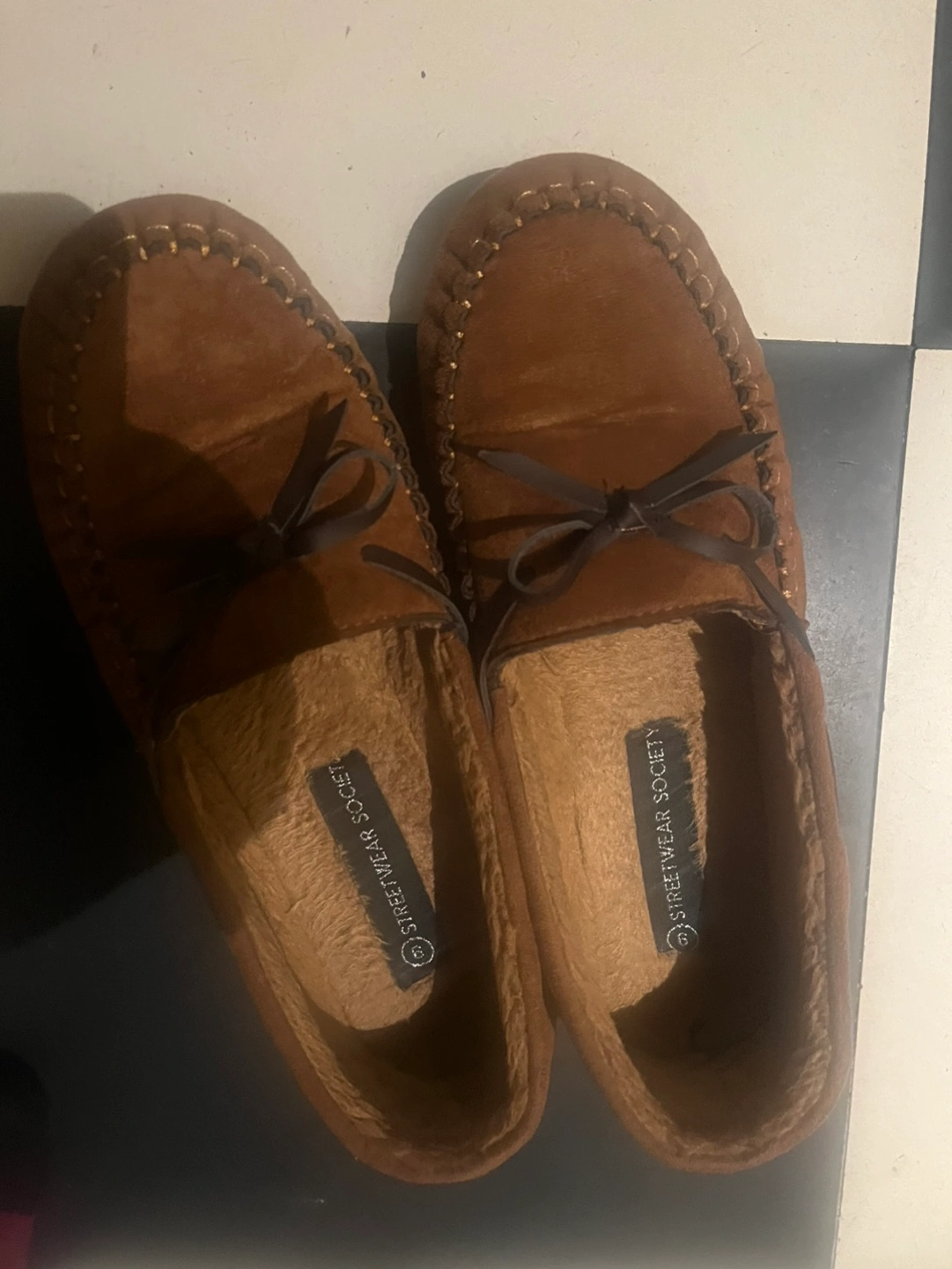 Women's brown suede moccasins . Soft, comfortable, and cozy. Bow detail on top. Good for lounging around the house.