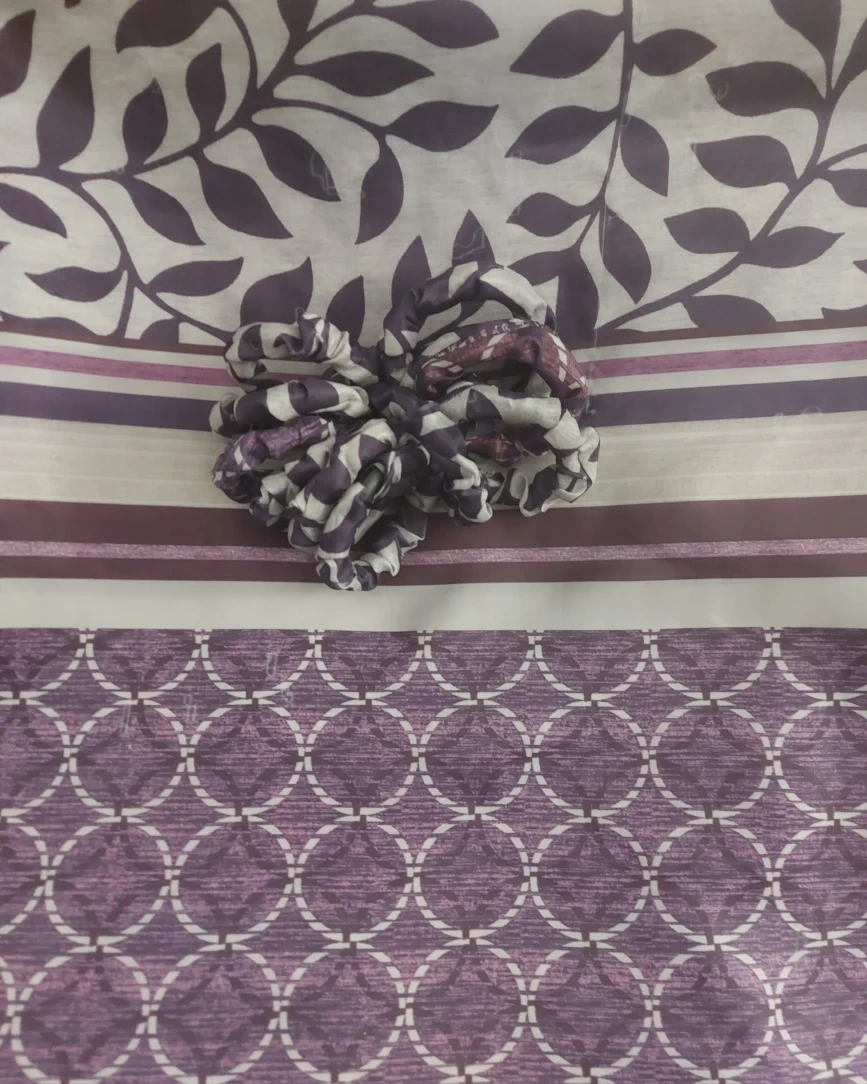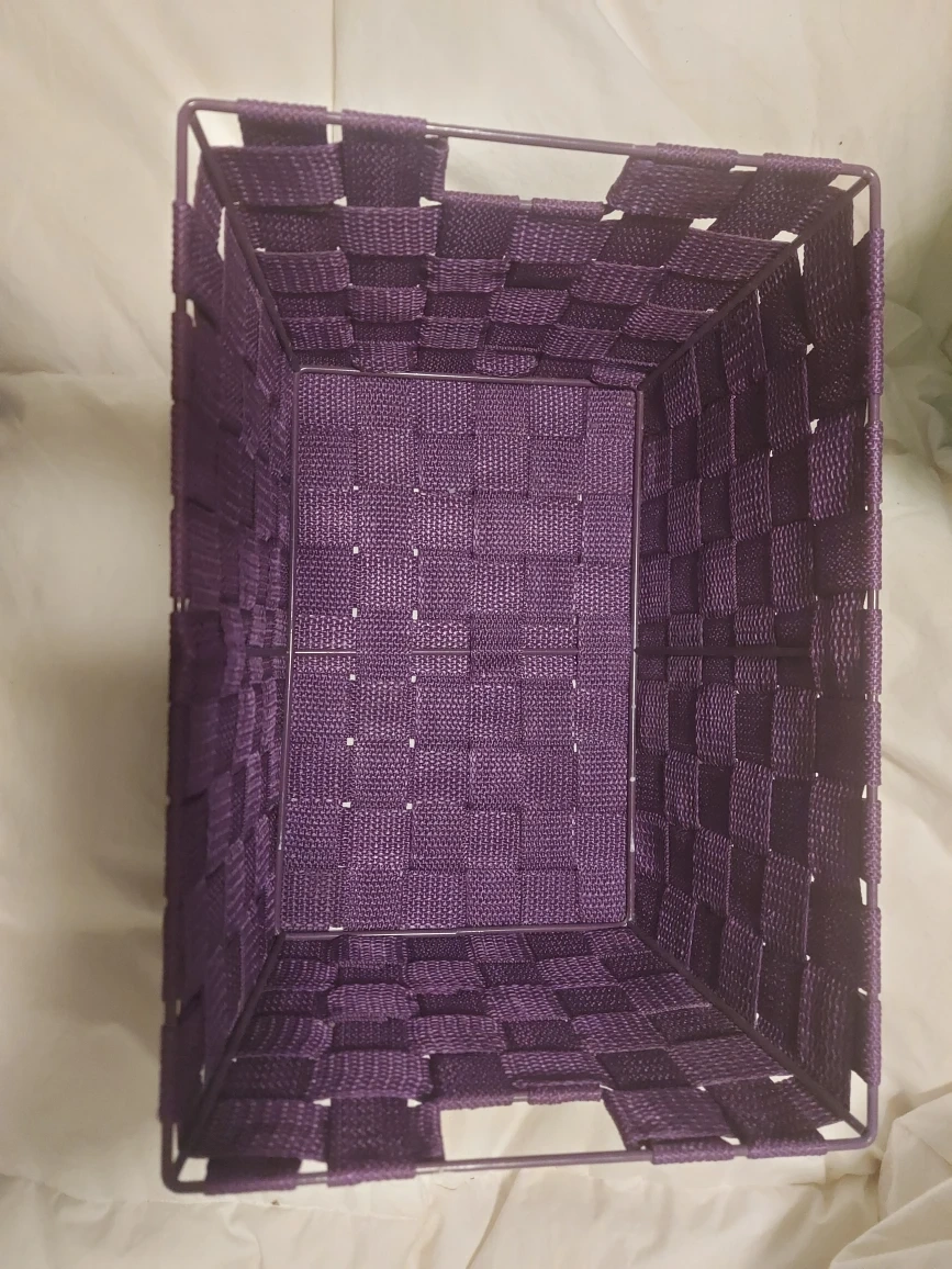 Bathroom Set. Fabric Shower Curtain (100% polyester), matching rings, sink carpet and toilet carpet, purple basket.
