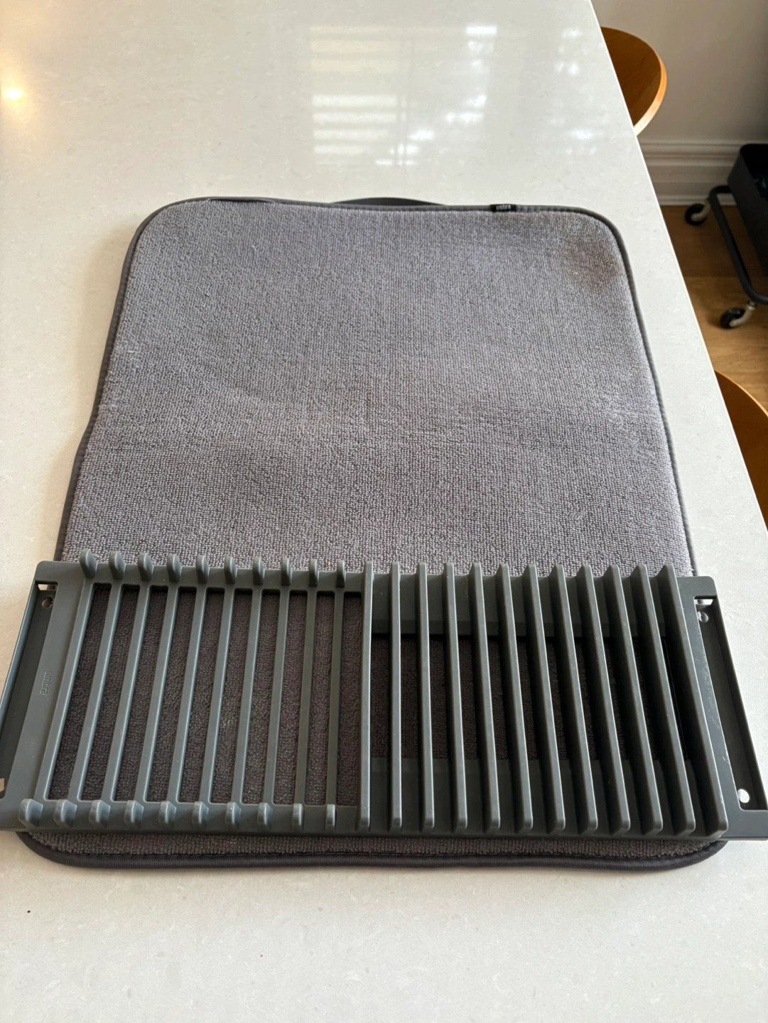 Grey dish drying rack and mat. Compact design. Perfect for small spaces. Durable and easy to clean.