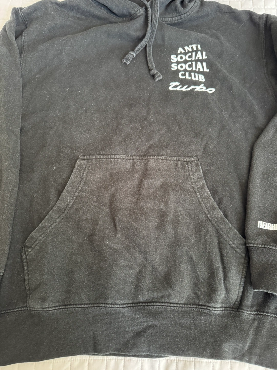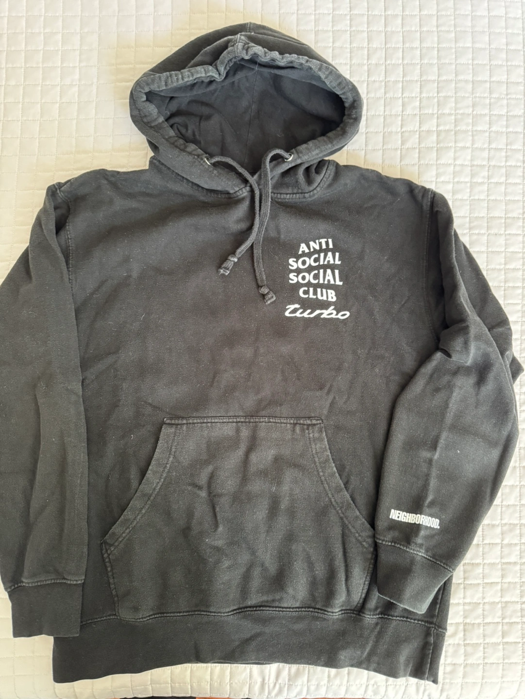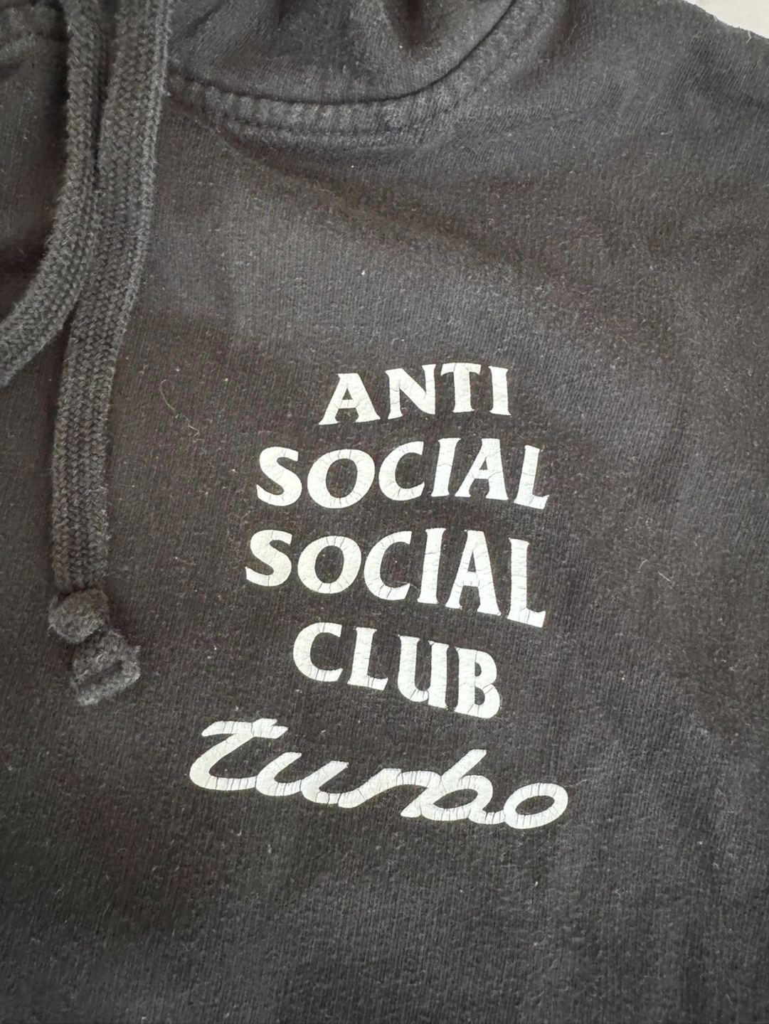 32Black Anti Social Social Club hoodie. Features a large white "Anti Social Social Club Turbo" graphic on the chest and Neighborhood branding on the sleeve. Kangaroo pocket. Drawstring hood.