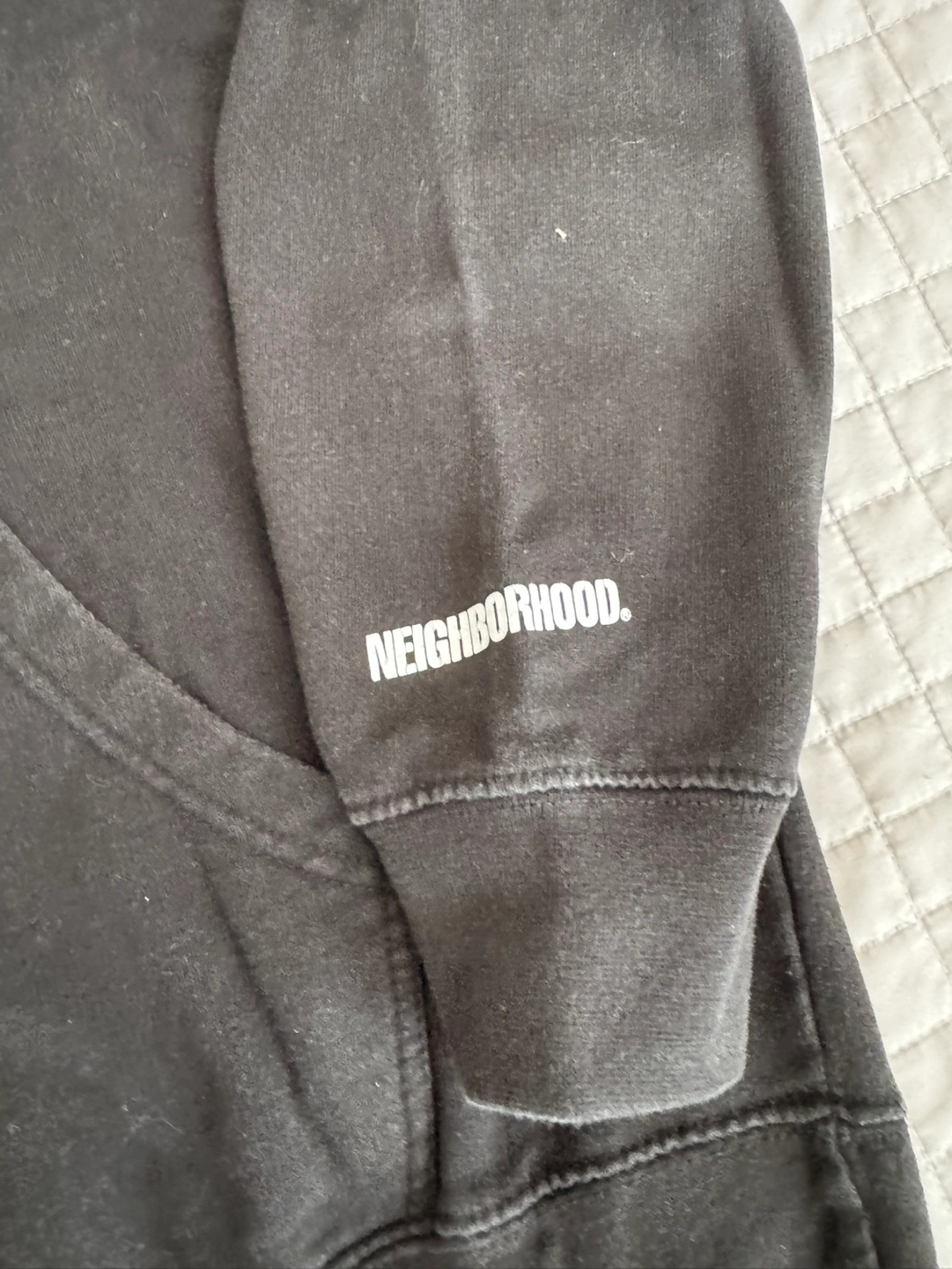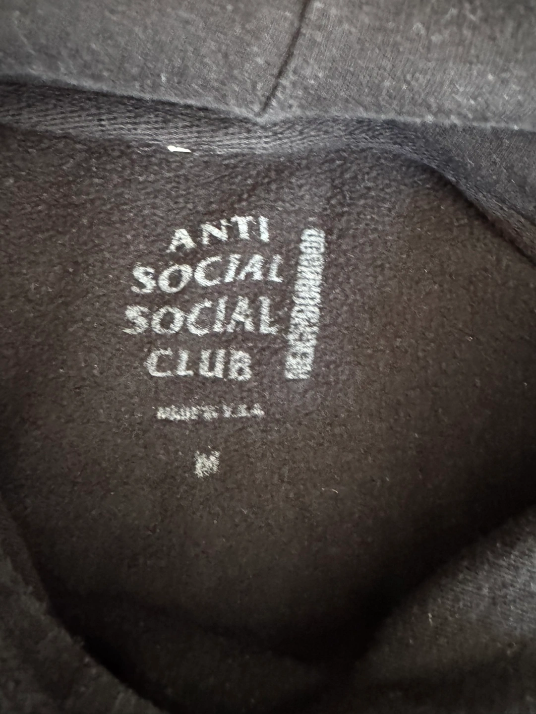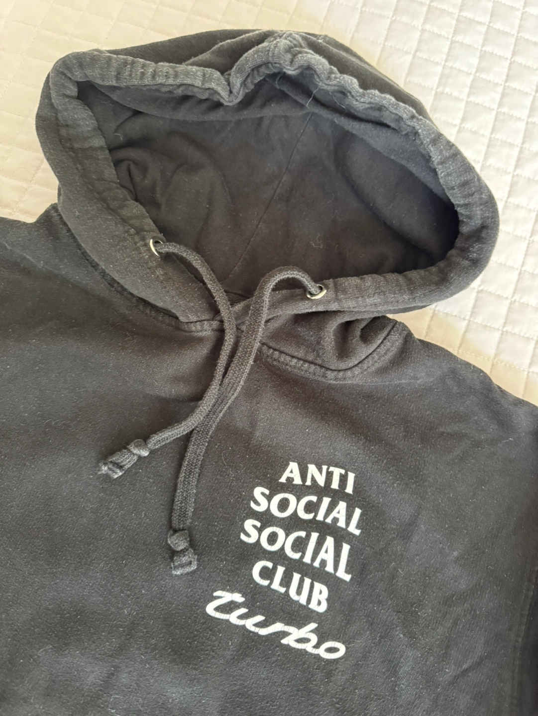 32Black Anti Social Social Club hoodie. Features a large white "Anti Social Social Club Turbo" graphic on the chest and Neighborhood branding on the sleeve. Kangaroo pocket. Drawstring hood.