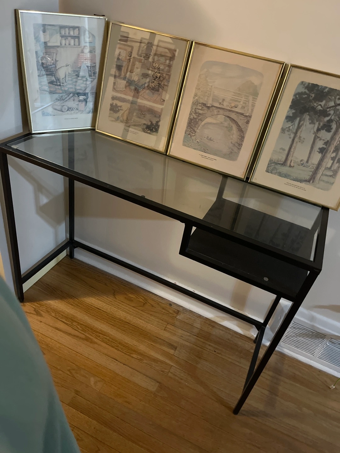 Small glass top desk. Black metal frame. Simple design. Minimalist style. Perfect for small spaces.