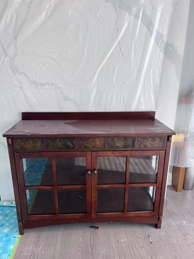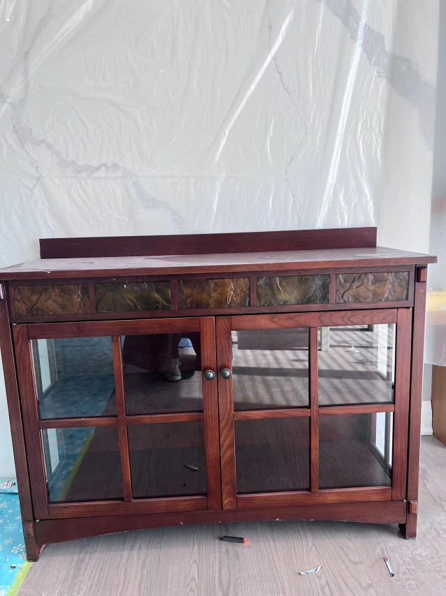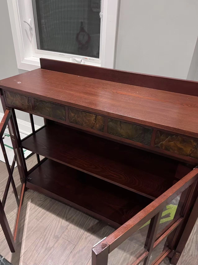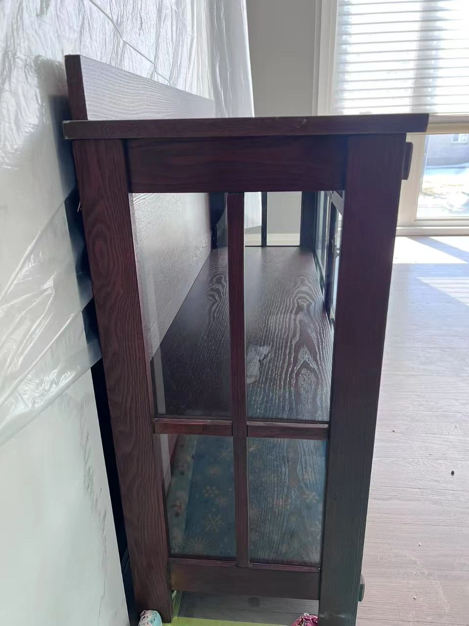 Wooden curio cabinet. Features glass doors, two shelves, and a decorative top panel. Dark brown finish. No wear, just dust in photos. Pick up: Waterloo Avenue & Goddard Street