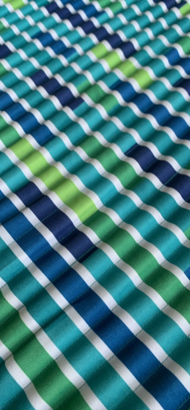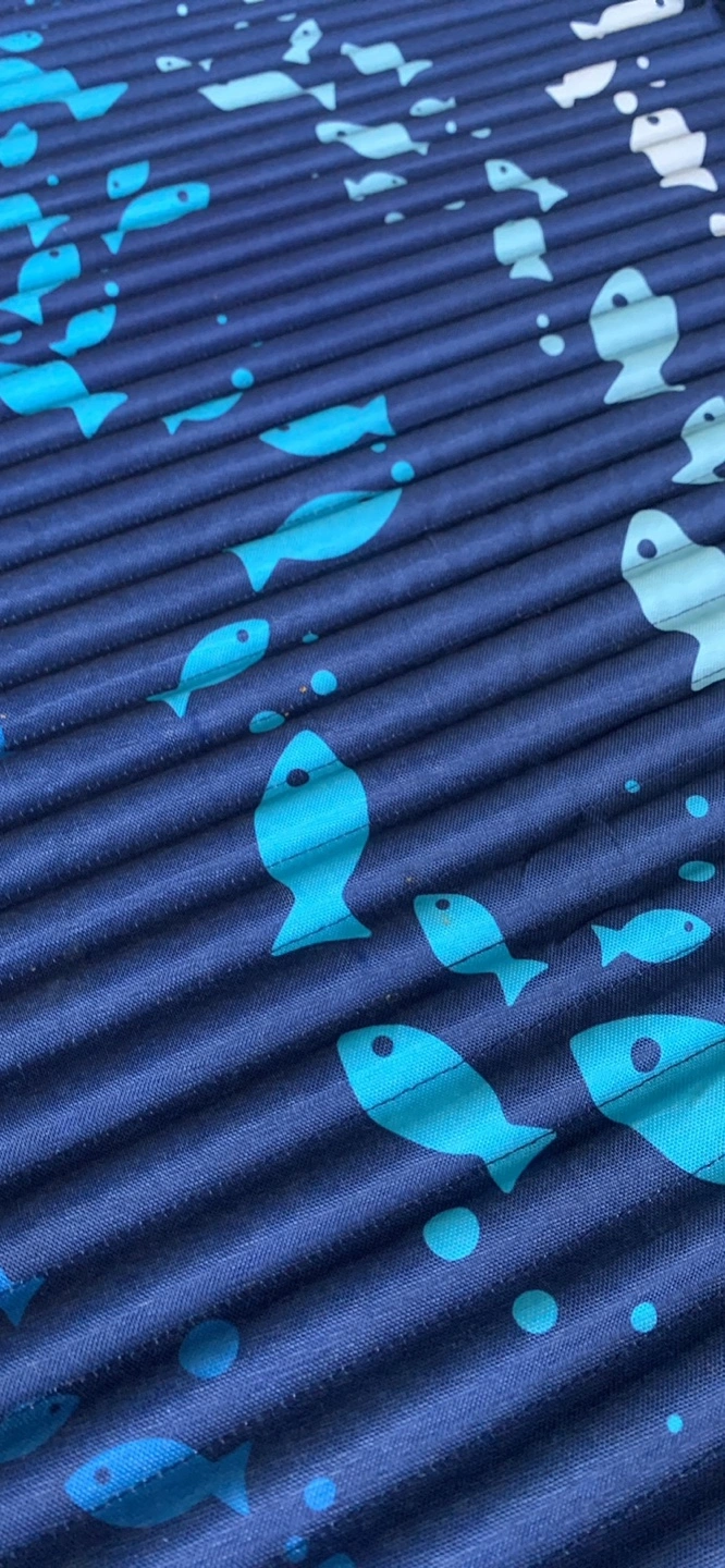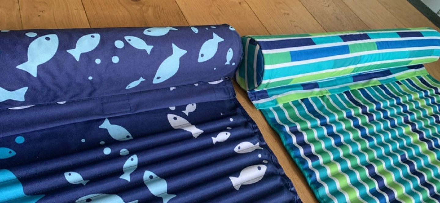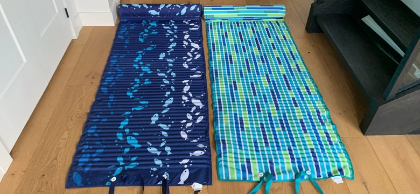 2 beach mats. One features a blue fish pattern, the other a teal and green striped design. Both roll up for easy storage.