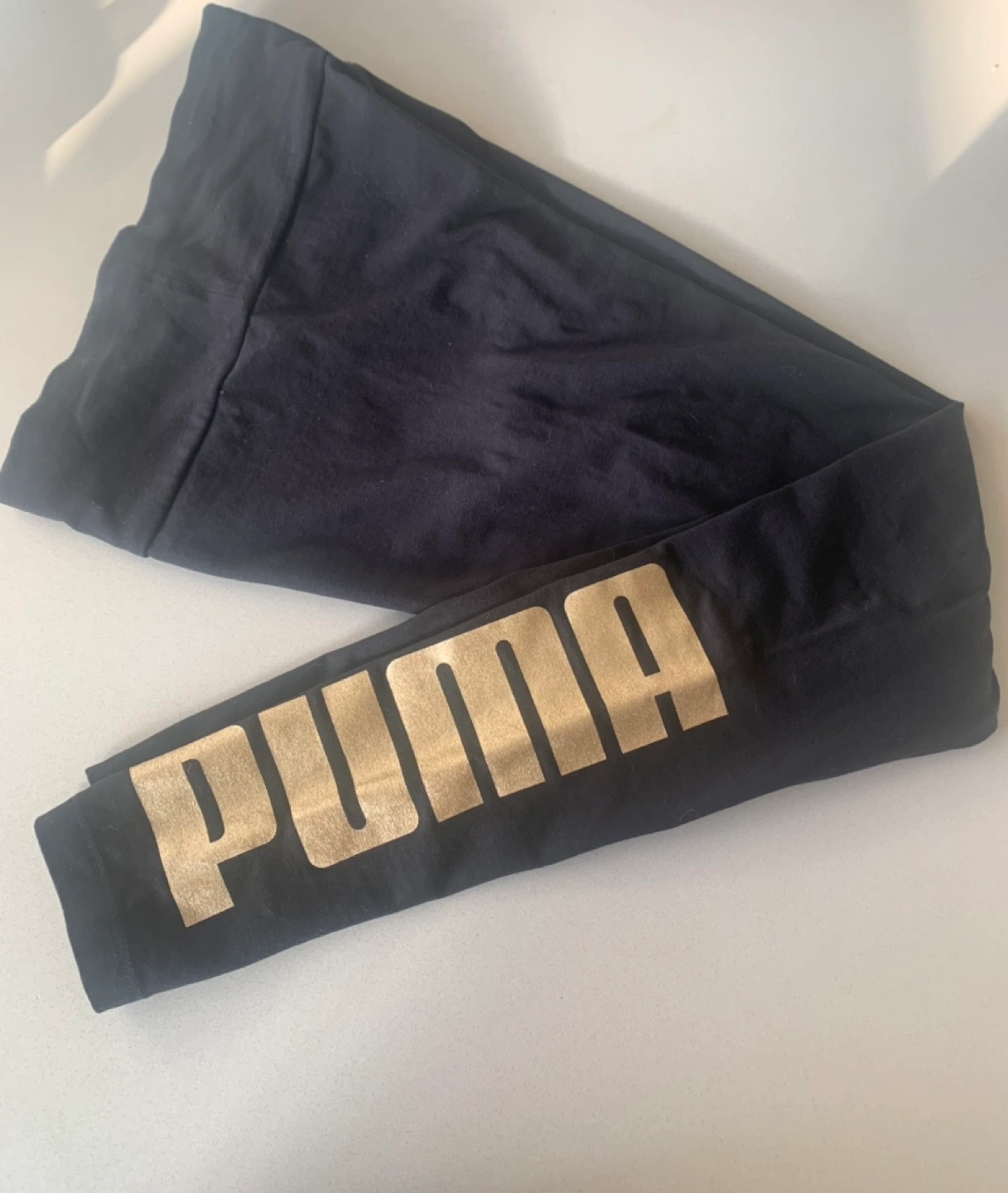 Black Puma leggings. Size XS. Gold Puma logo on one leg and white Puma logo on the other. Cut one of the tags so not sure the material. Excellent condition, barely worn.