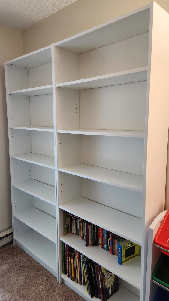 Two tall white bookcases. Multiple shelves. Great for storage. Assembled.