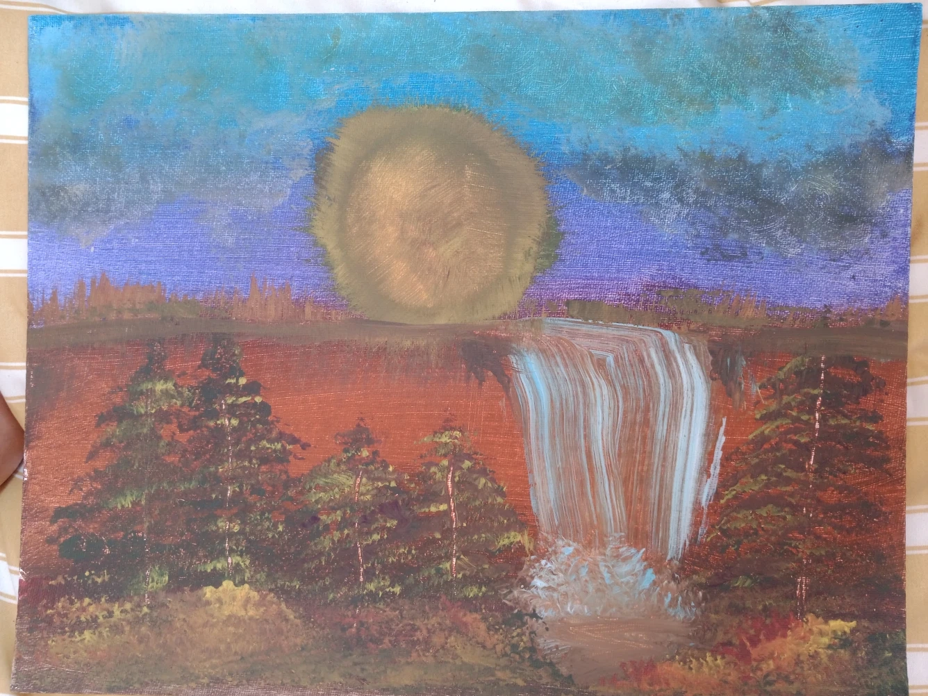Hand-painted canvas landscape. Features a waterfall, trees, and a large sun. Vibrant colors and unique style. Ready to hang.