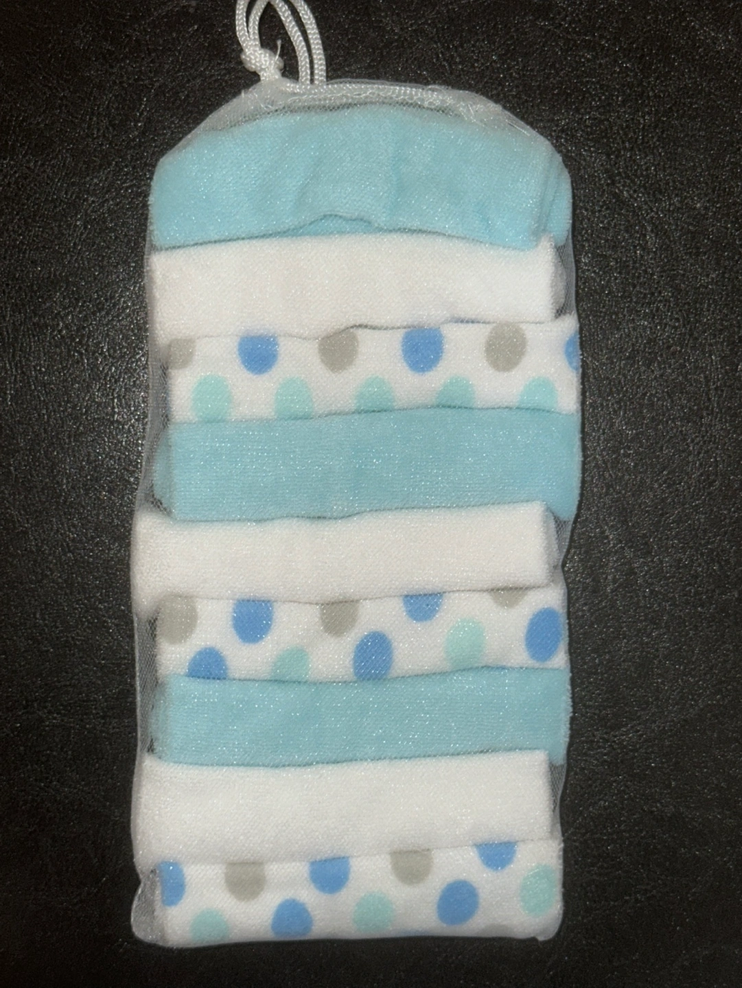 8 pieces of baby washcloths. Soft and absorbent. Blue, white and grey polka dot pattern. Perfect for messy eaters.