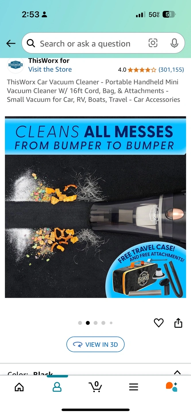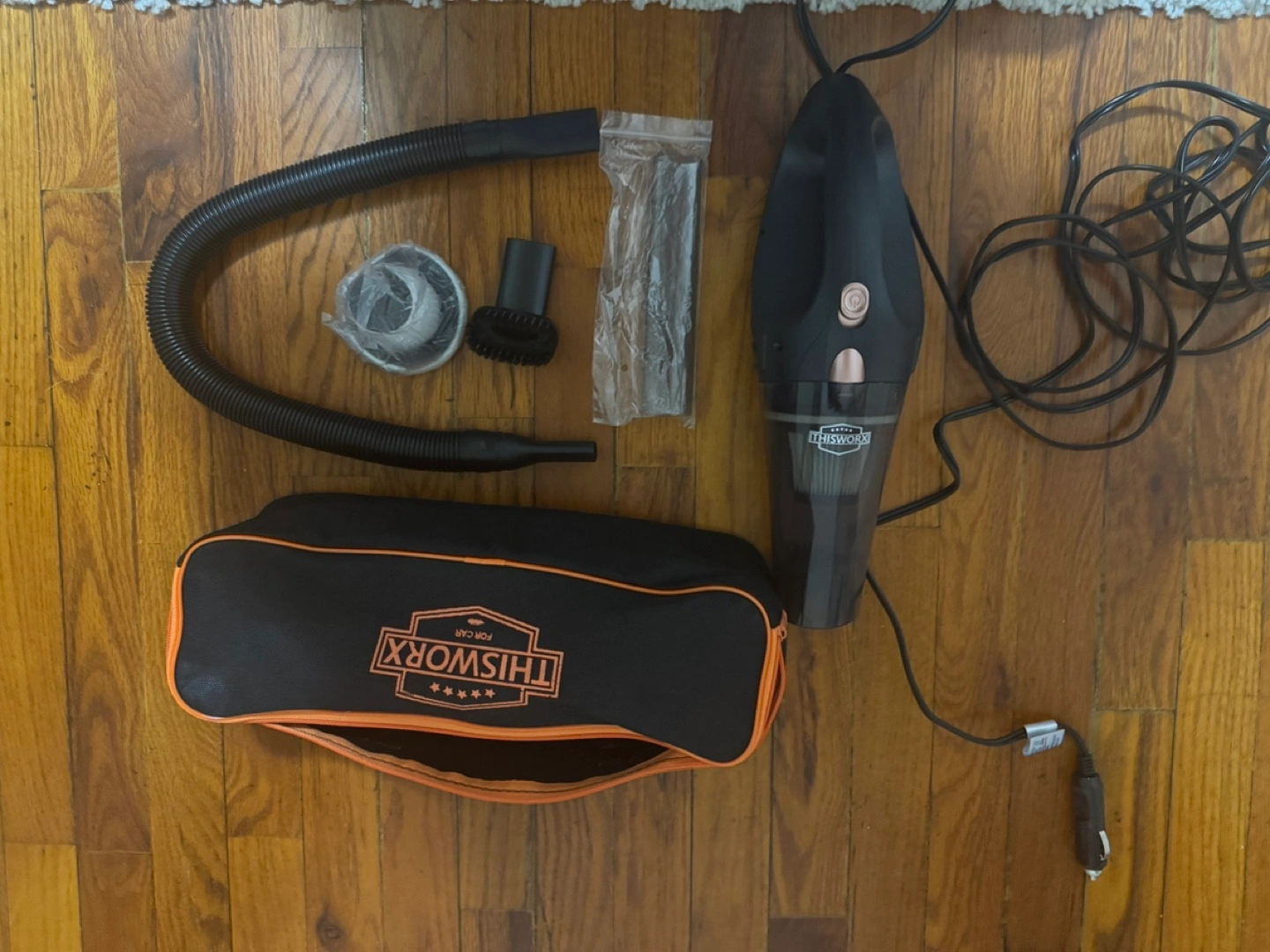 Portable mini vacuum cleaner. 12V Cigarette Lighter Cord. Includes 16ft cord, bag, and attachments. Great for cars, RVs, boats, and travel. Compact size. Comes with carrying case.