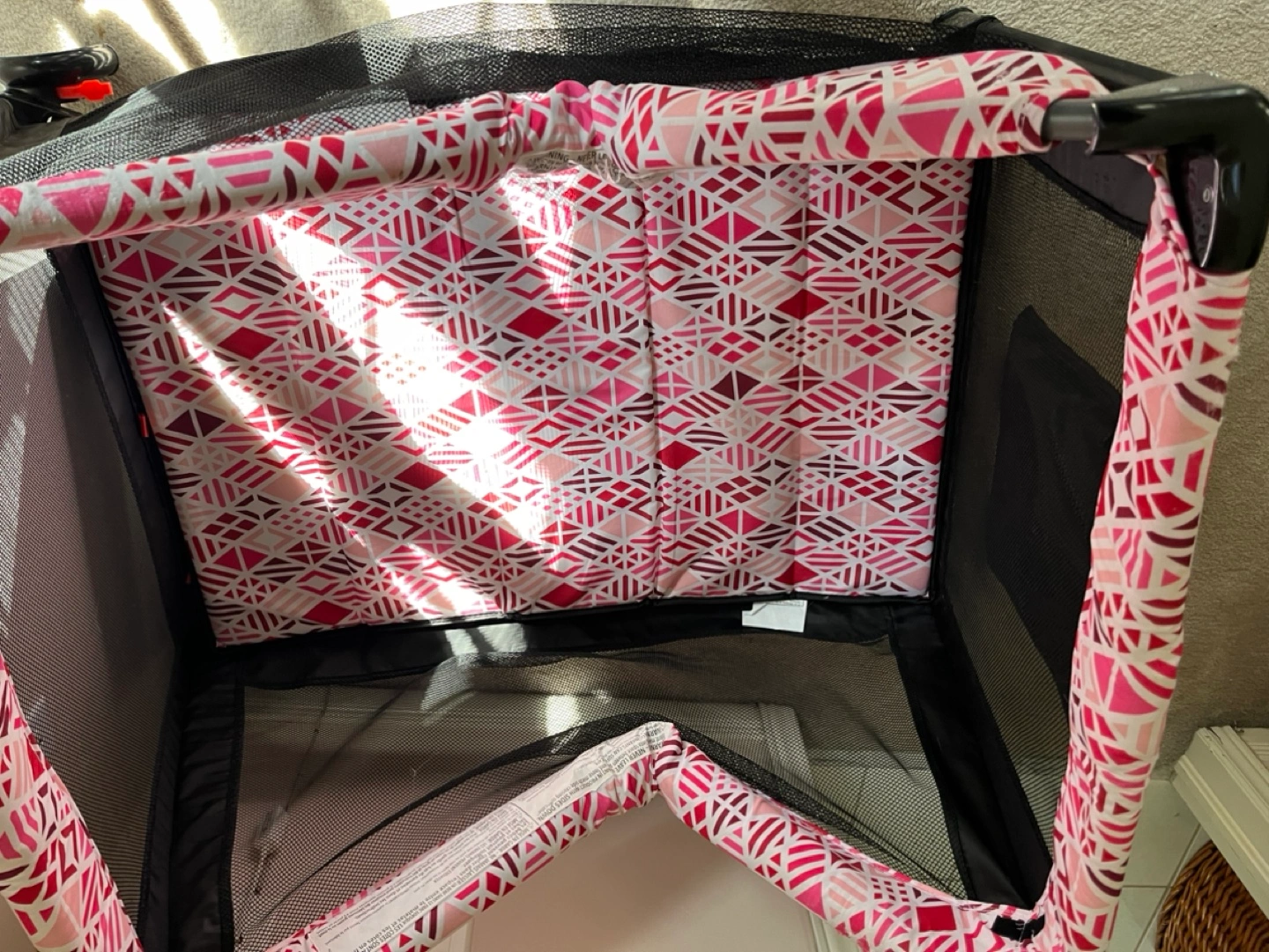 Pink and white geometric patterned portable playard. Easy to fold and store. Includes carrying case. Great for travel or home use.