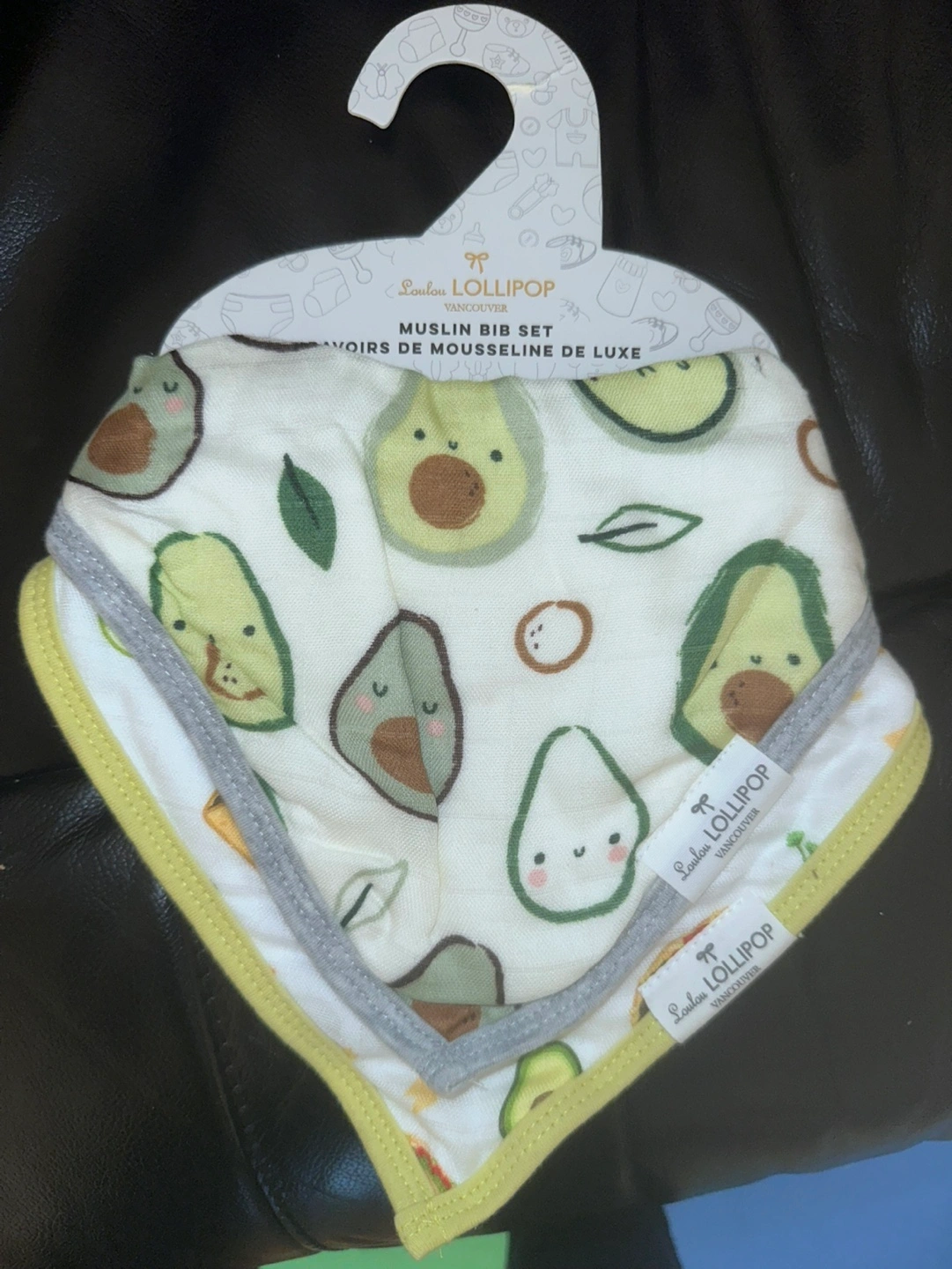 Purchased from snuggle bugz. Adorable baby bib set. Features a cute avocado print. Muslin material. Soft and absorbent.