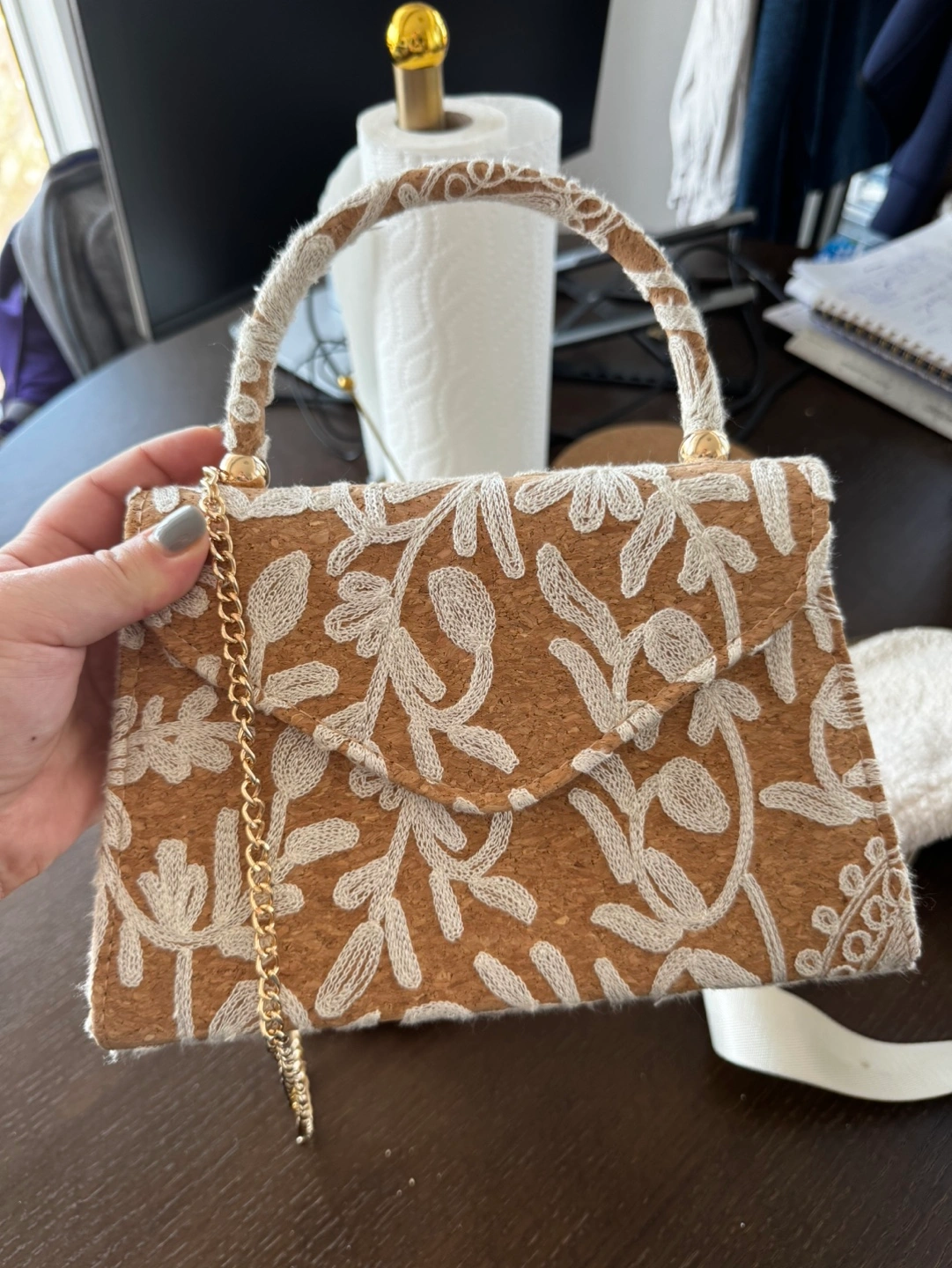 Small embroidered boho cork purse. Features a top handle and a gold chain strap. Unique floral design.