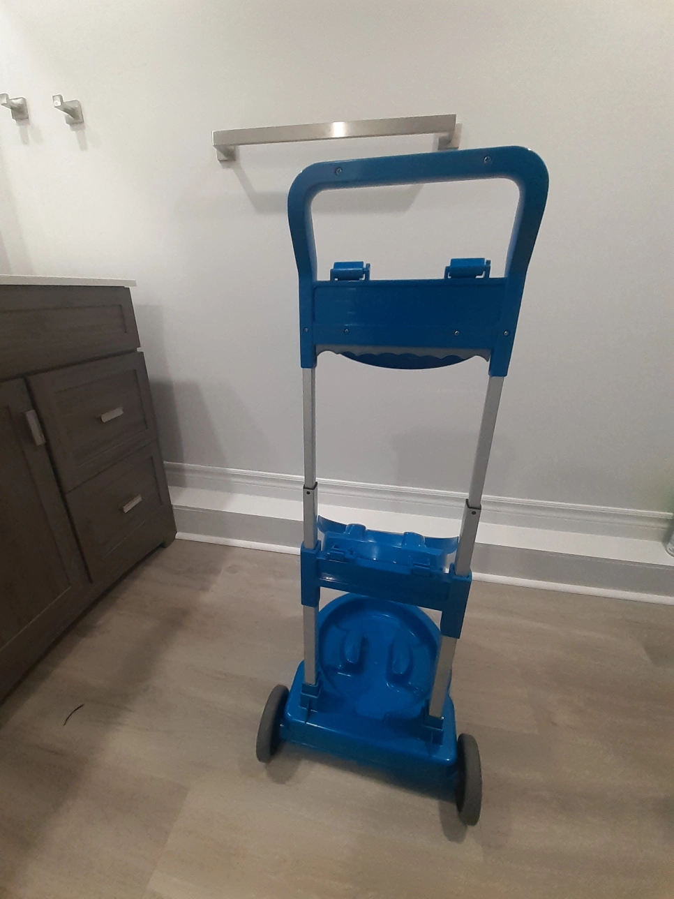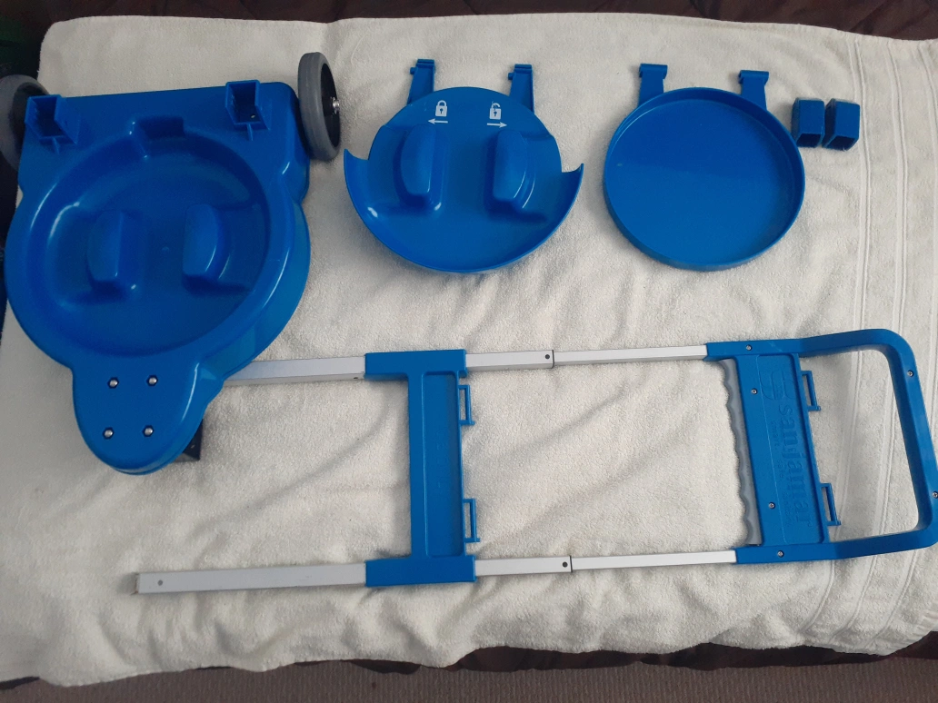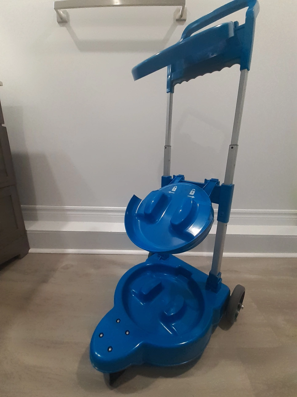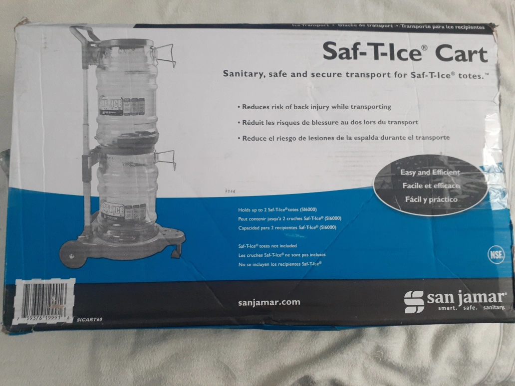 101Blue plastic cart for transporting Saf-T-Ice totes. Collapsible design, easy to store. Includes two circular blue plastic trays. Wheels for easy mobility. Great for restaurants, bars, and healthcare facilities.