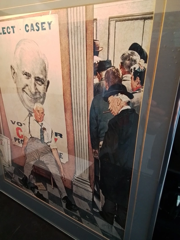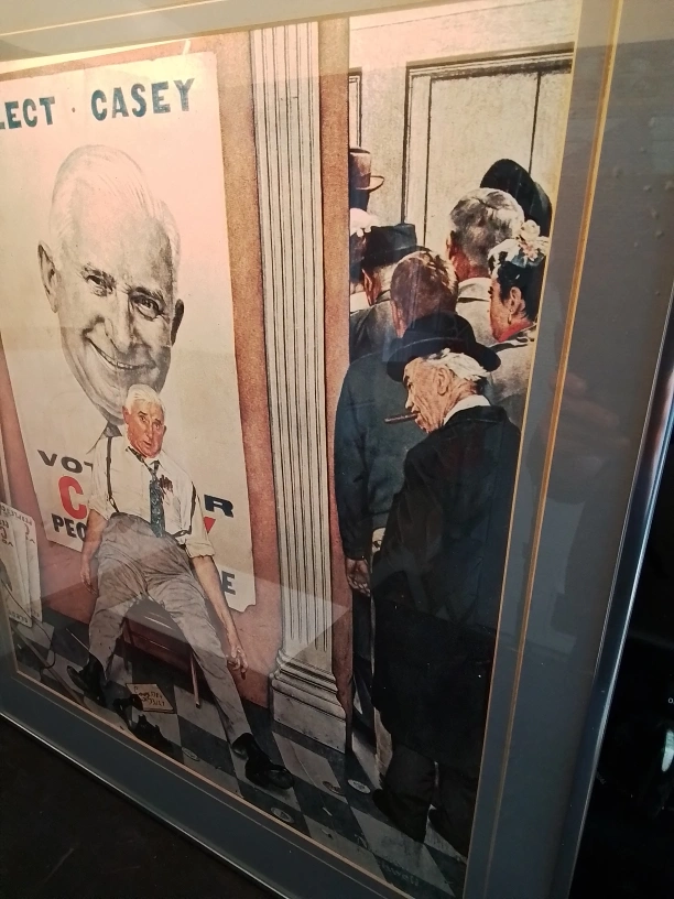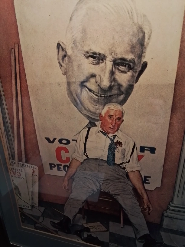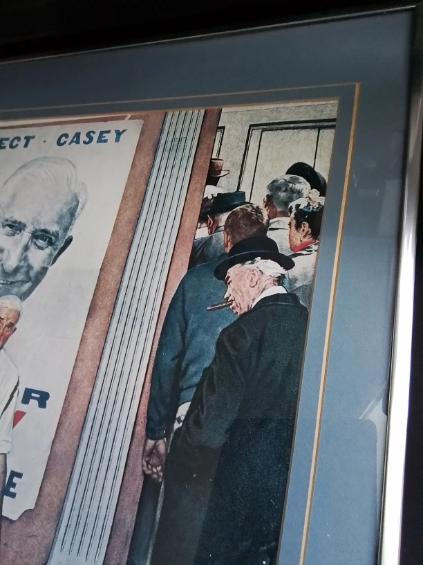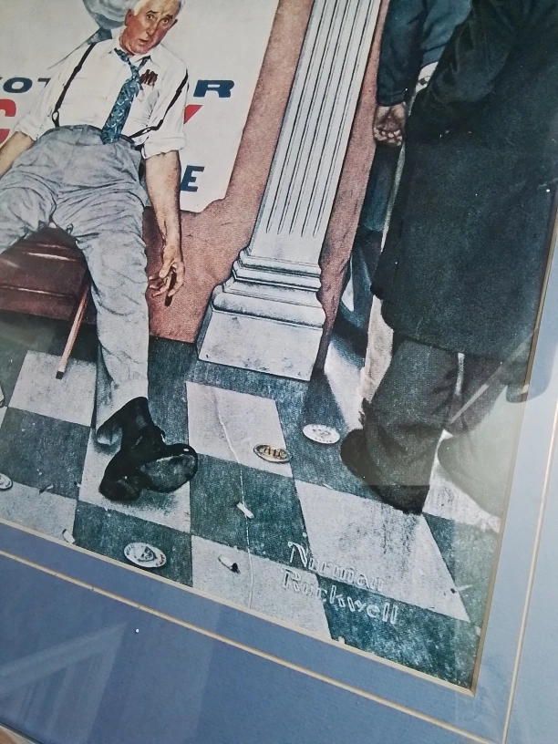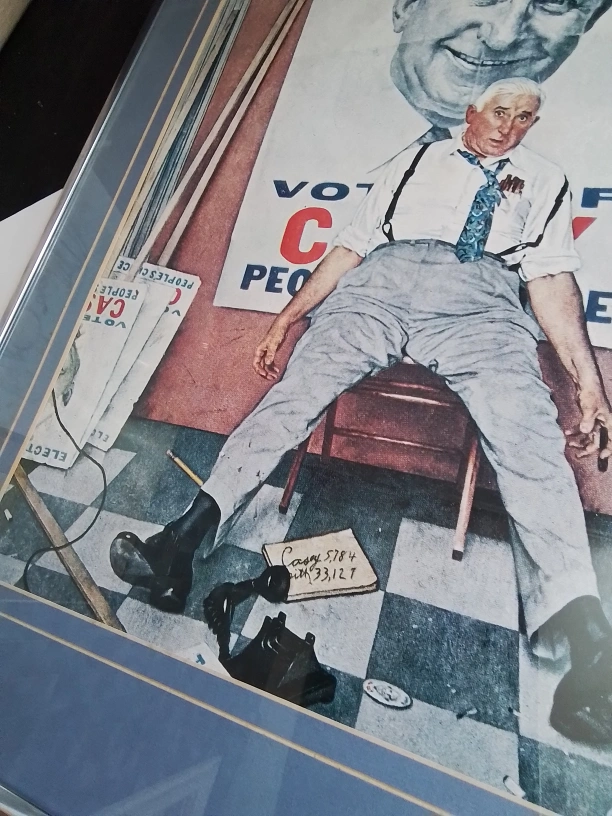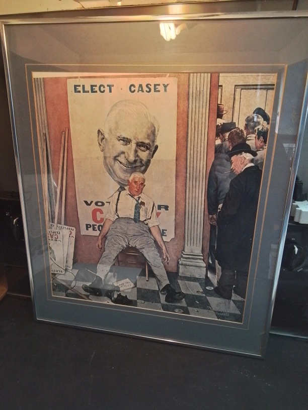 114Norman Rockwell Framed Print - Before and After Norman Rockwell Framed Print - Elect Casey Framed print featuring a Norman Rockwell illustration. Depicts a man passed out near a voting poster. Silver frame. Great piece for collectors. Custom framed in a silver coloured frame, behind a slate grey mat, a large print by Norman Rockwell of his election themed paintings '' Before and After'', which appeared as the cover of the '' Saturday Evening Post'' on November 8th 1958. Condition: Good Measurements: 20 x 24 Pickup at Young Street and Steels Ave