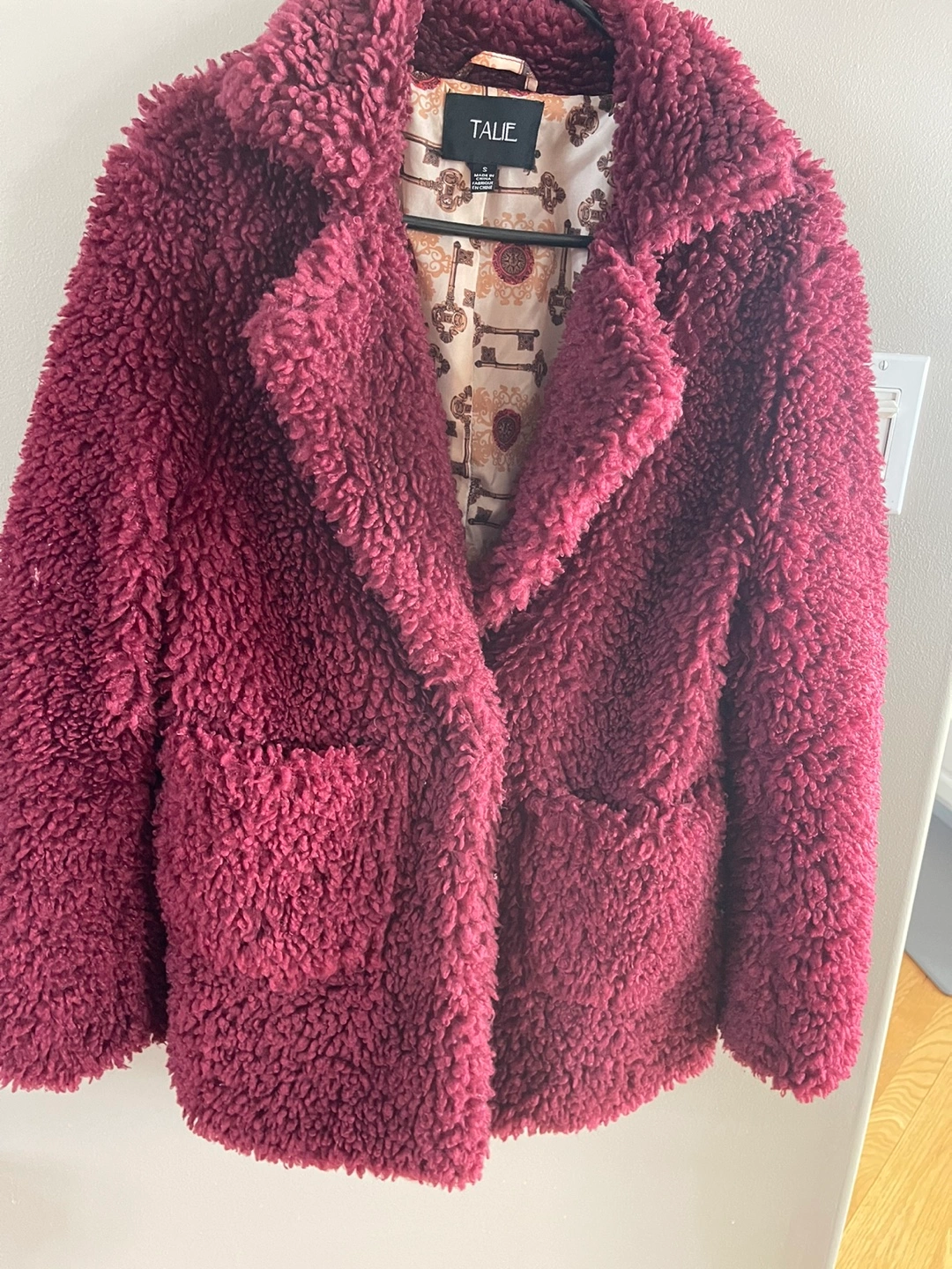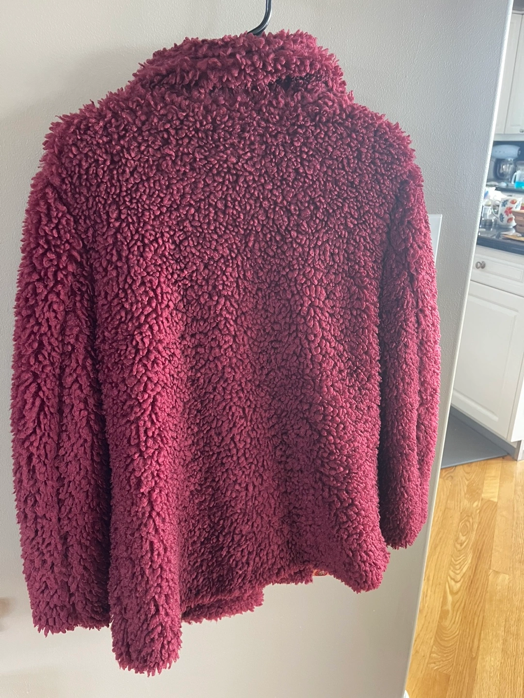 754Cozy burgundy teddy coat. Long sleeves, pockets. Soft material, perfect for colder weather. Snap Button closure. Fits like a LARGE. Day 2🧡