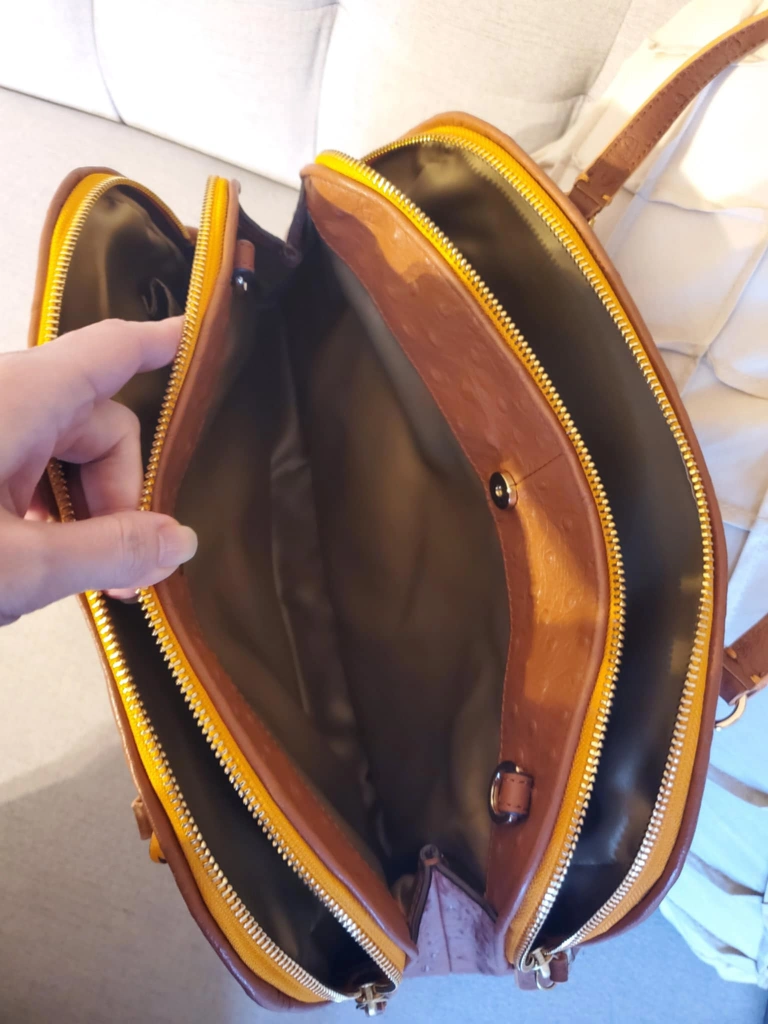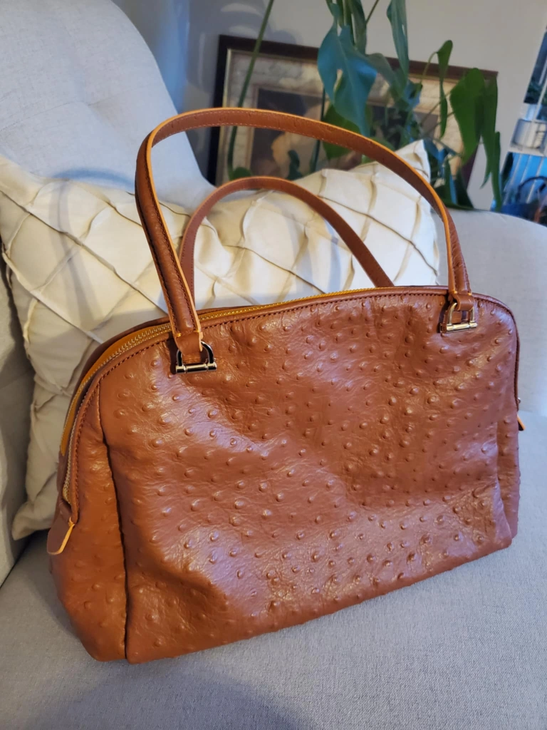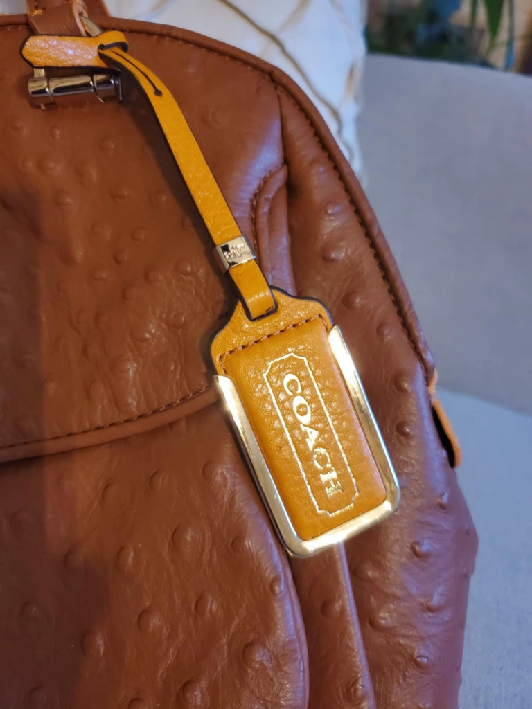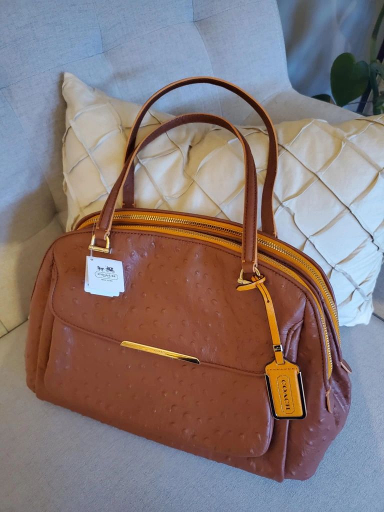 69New with tag Coach Limited Edition Madison Georgie 30113 Ostrich Embossed Leather Satchel Shoulder Bag $548. Double Handles with 8" drop. Additional Shoulder bag strap with 13" drop. One Lozenge logo Tag. Gold Polished Hardware. Interior: two zip compartments. One compartment has a zip pocket with Coach Creed Tag. Other compartment has 2 multi function pockets. Approximate measurements: 14" L x 9'' h x 6'' w. Coach Care Card included.