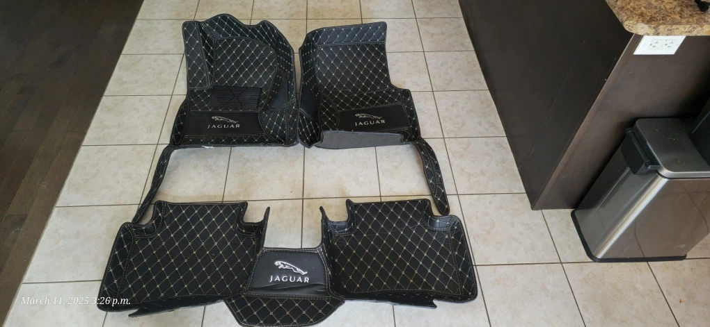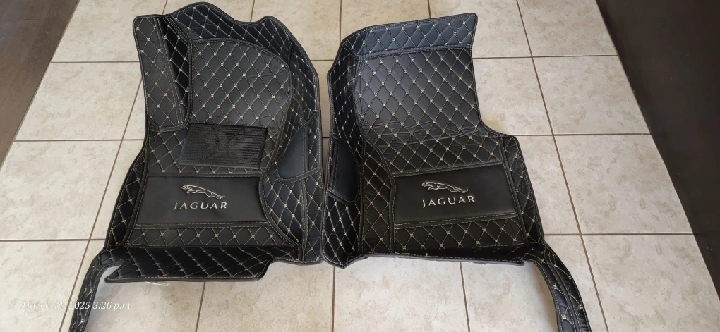 27Four-piece floor mat set. Black with diamond stitching and beige accents. Jaguar logo embroidered on each mat. Looks new. Diamond Custom Floor Mats for Jaguar F-Pace (2018-2024) Black with Red. This is good for Jaguar F pace model.