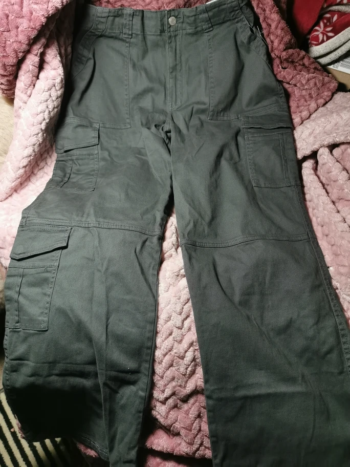 Women's cargo pants, dark grey colour. Multiple pockets. Straightwide leg and adjustable things at the back. it passed the return window and I never wore them. is large but when adjusted to the smaller setting it's similar to a medium at the waist.