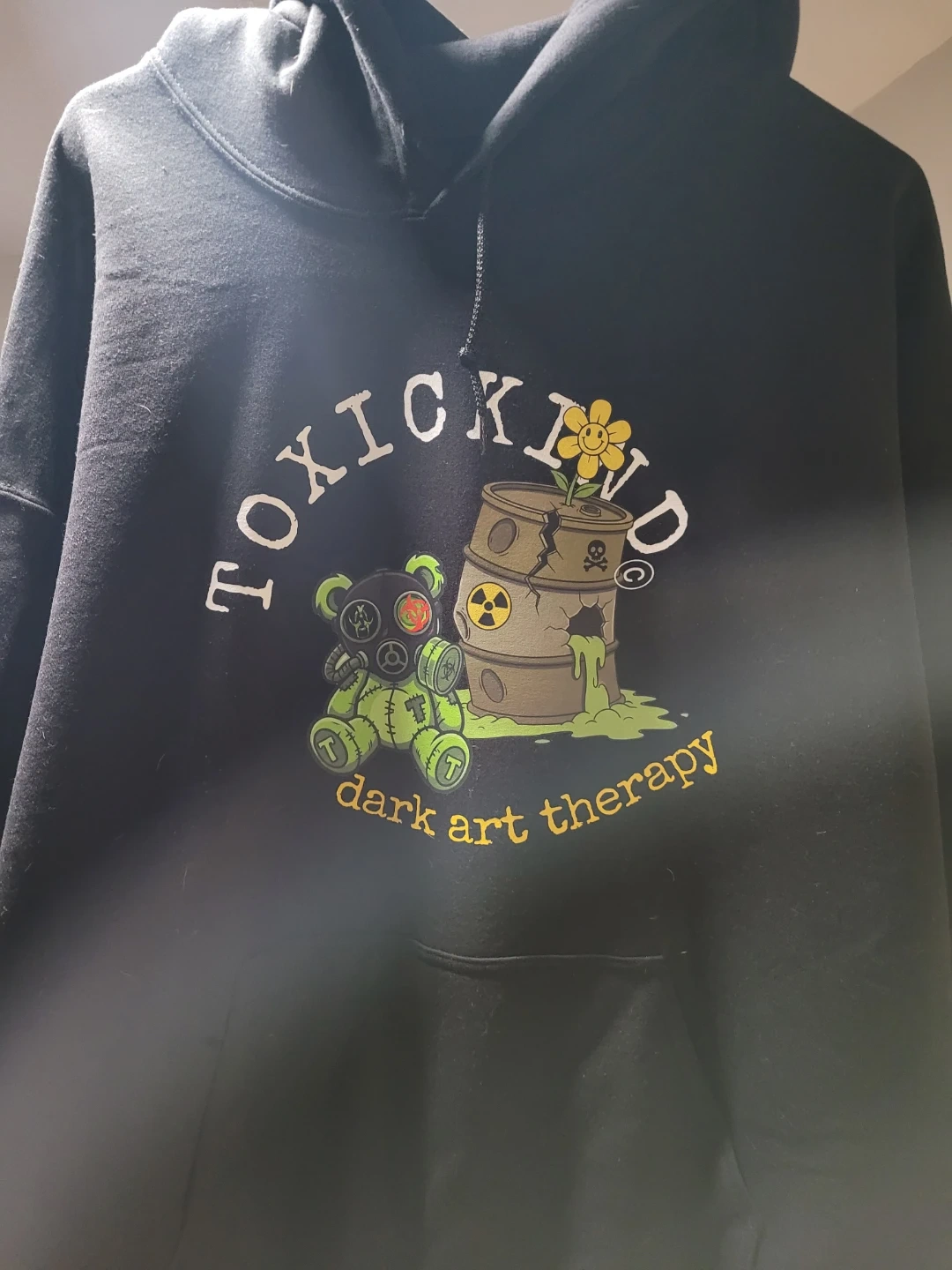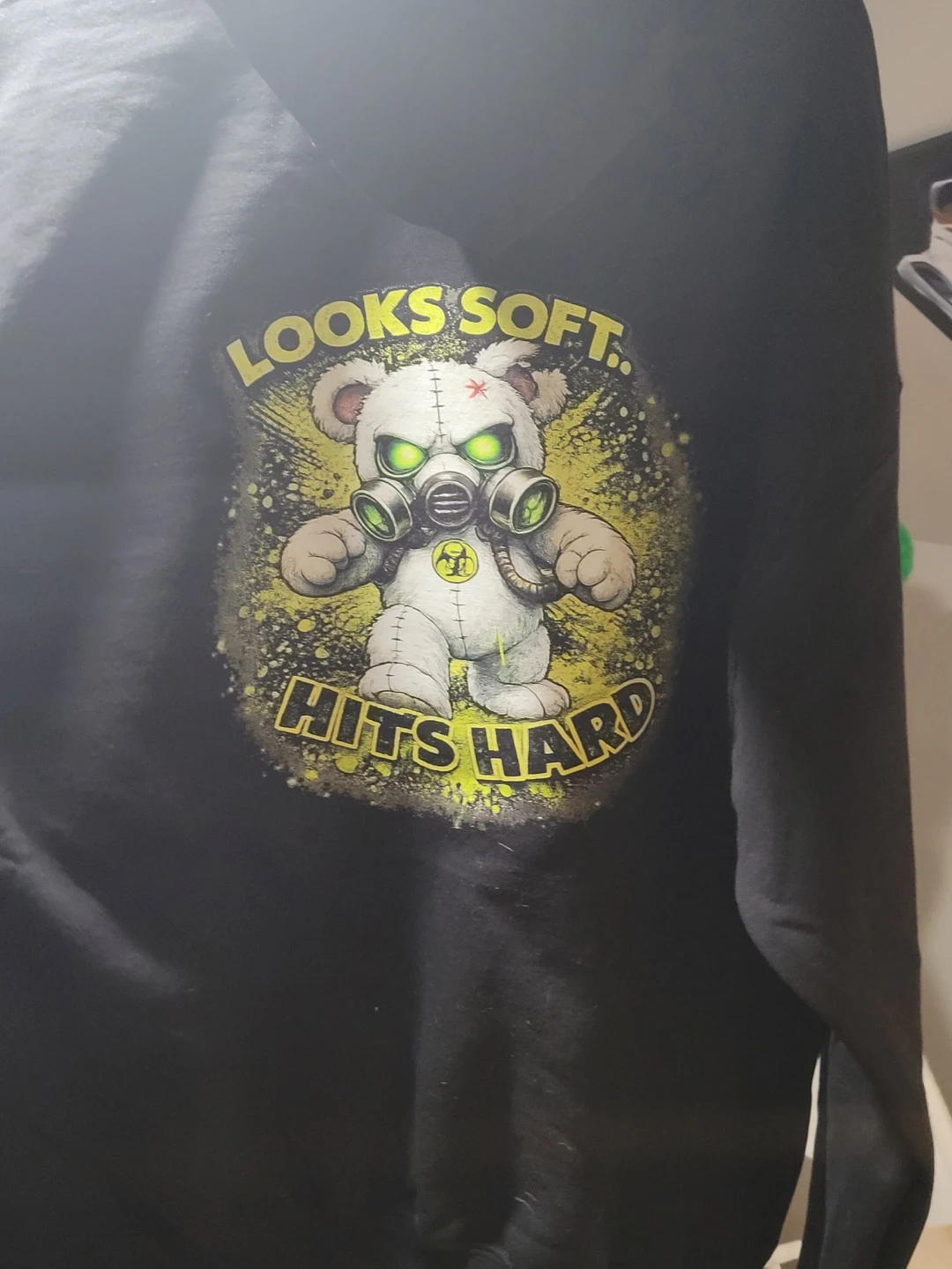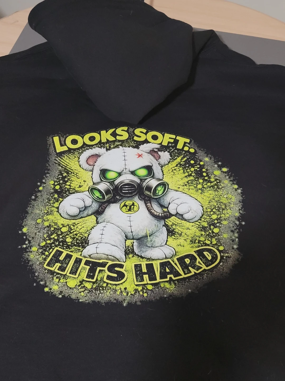 This black hoodie features a "Looks Soft.. Hits Hard" graphic with a distressed teddy bear in a gas mask. It also has a "Toxic Kind Dark Art Therapy" design on the front. Made from a soft material for comfort.