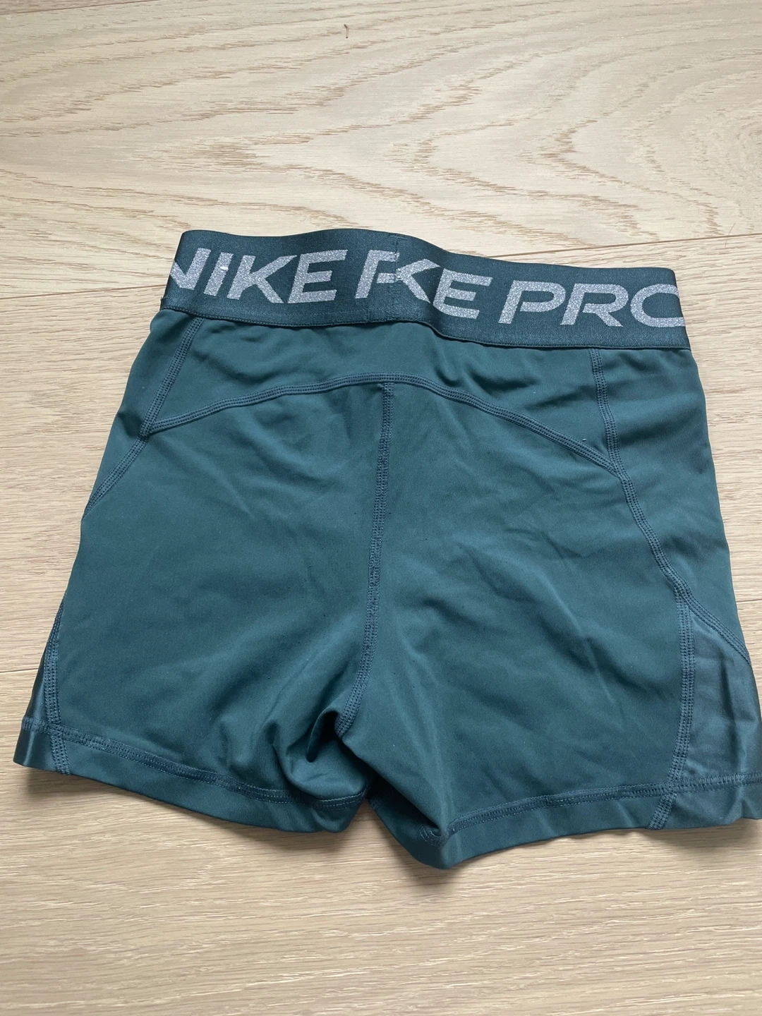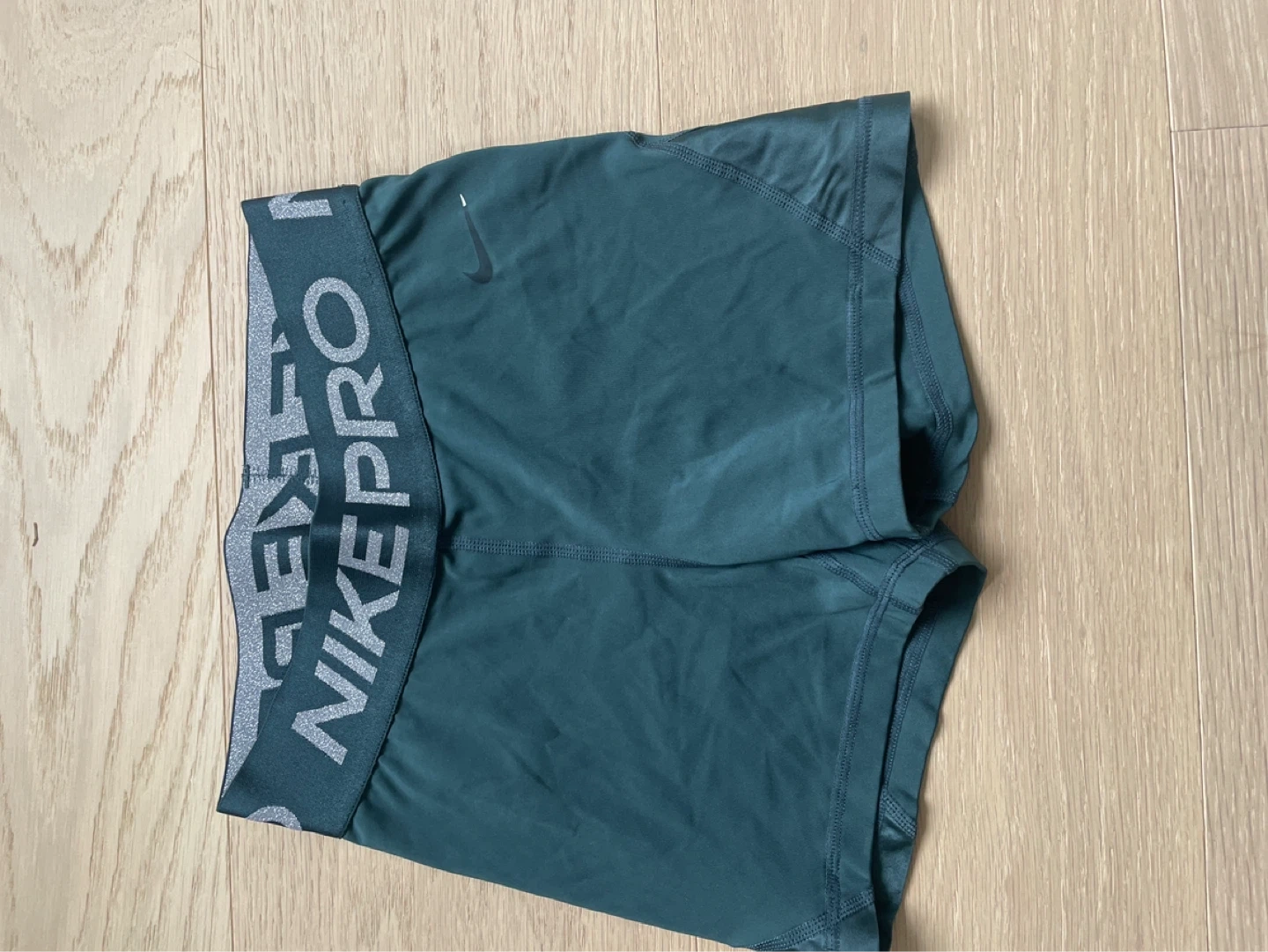 Nike Pro compression shorts in a teal colour. Elastic waistband with Nike Pro branding. Designed for athletic performance.