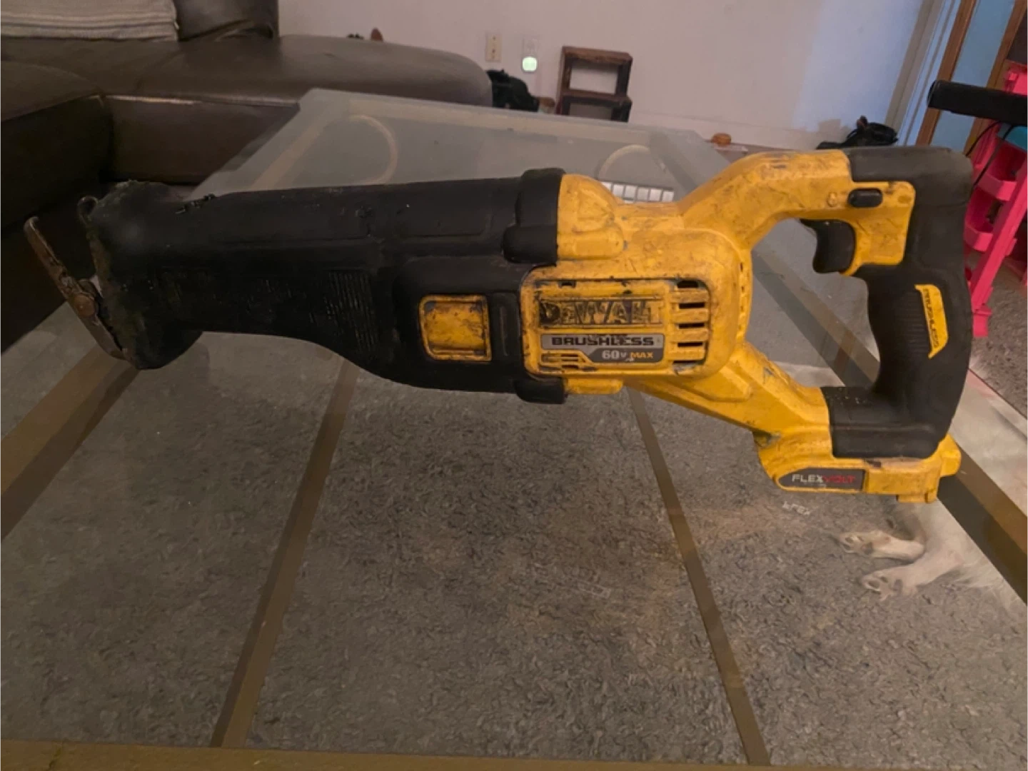 This DeWalt reciprocating saw features a brushless motor and variable speed control. It's a 60V MAX tool for powerful performance. This saw is great for demolition and cutting tasks.