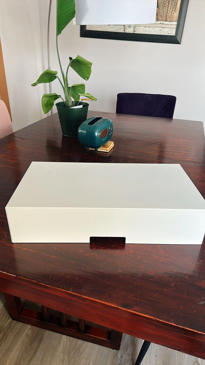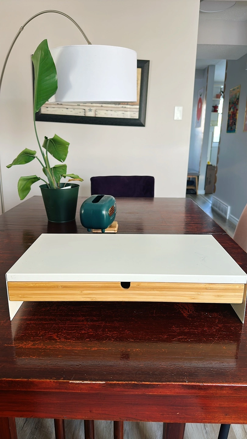 This is white metallic monitor stand with wooden drawer by IKEA. This item has been used, but it’s still in a good condition.