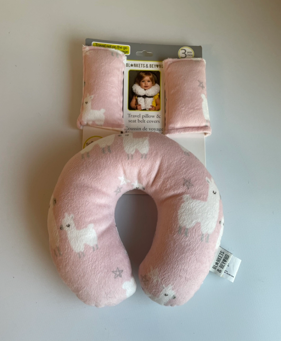 New travel pillow and two seatbelt covers. Pink llama print. Soft plush material. Perfect for kids.
