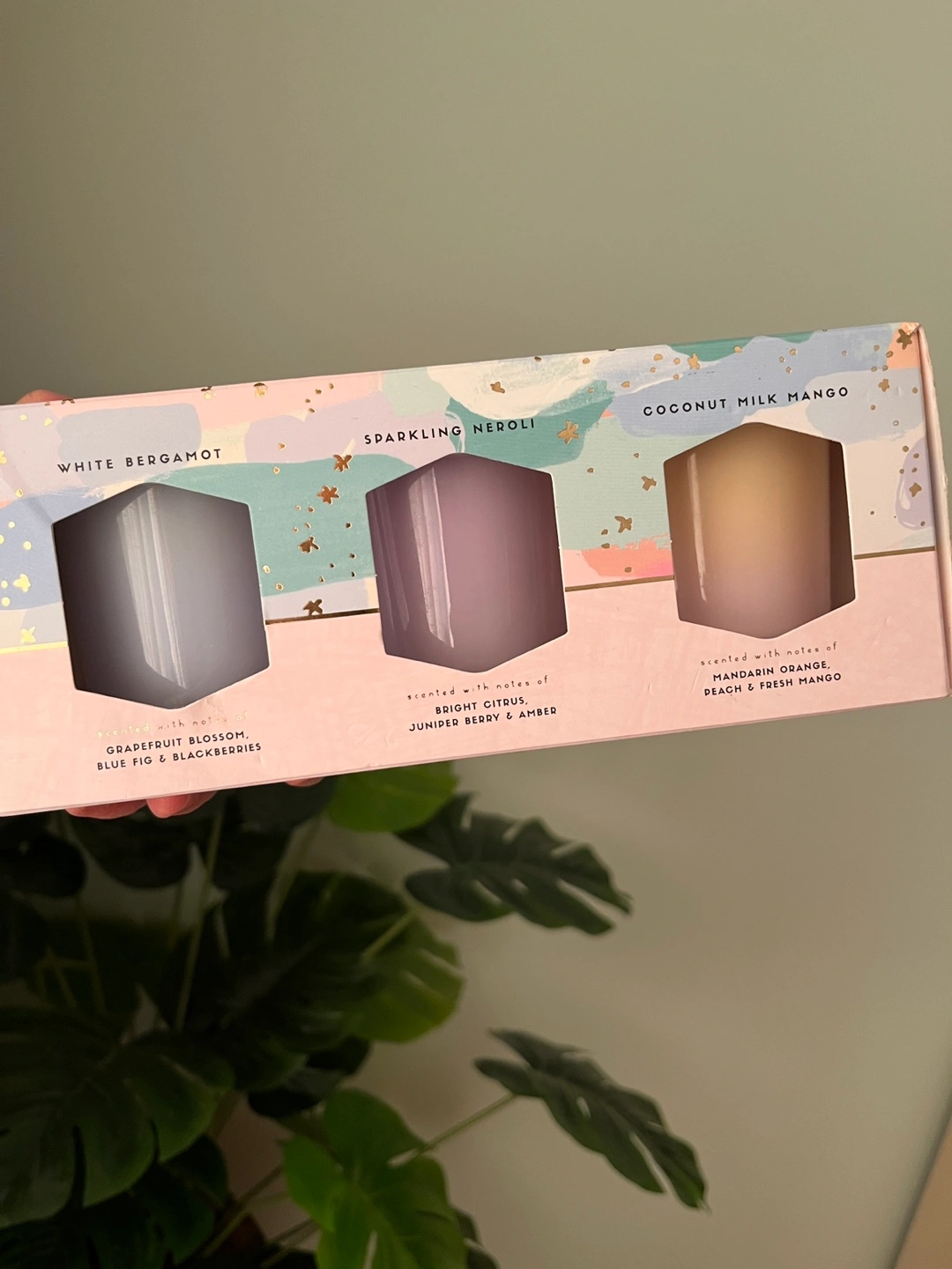 New, unopened box of three votive candles. Includes White Bergamot, Sparkling Neroli, and Coconut Milk Mango scents. Each candle weighs 65 grams.